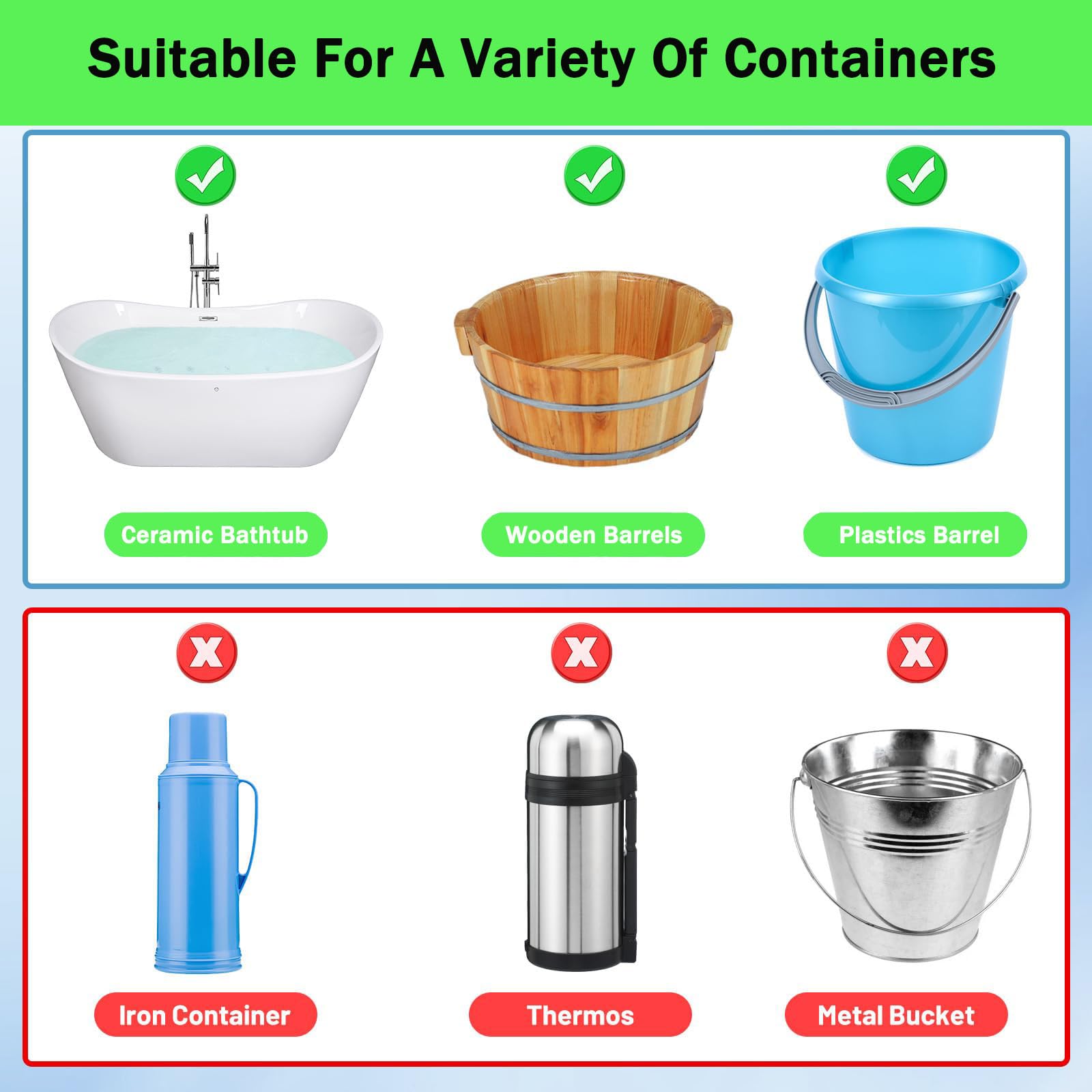 - WIDE APPLICATION: The portable shower heater can be easily stored with a length of only 10.2 inches and a weight of 0.77 pounds, making it convenient to carry. It is suitable for bathtubs, mini pools (using multiple), sinks, buckets, basins, etc., and is also ideal for camping, traveling, winter washing, farms, etc. WARNING: Always make sure that the water heater is fully submerged in water when in use, and do not let any part of it exposed to the air, as this can cause a fire.