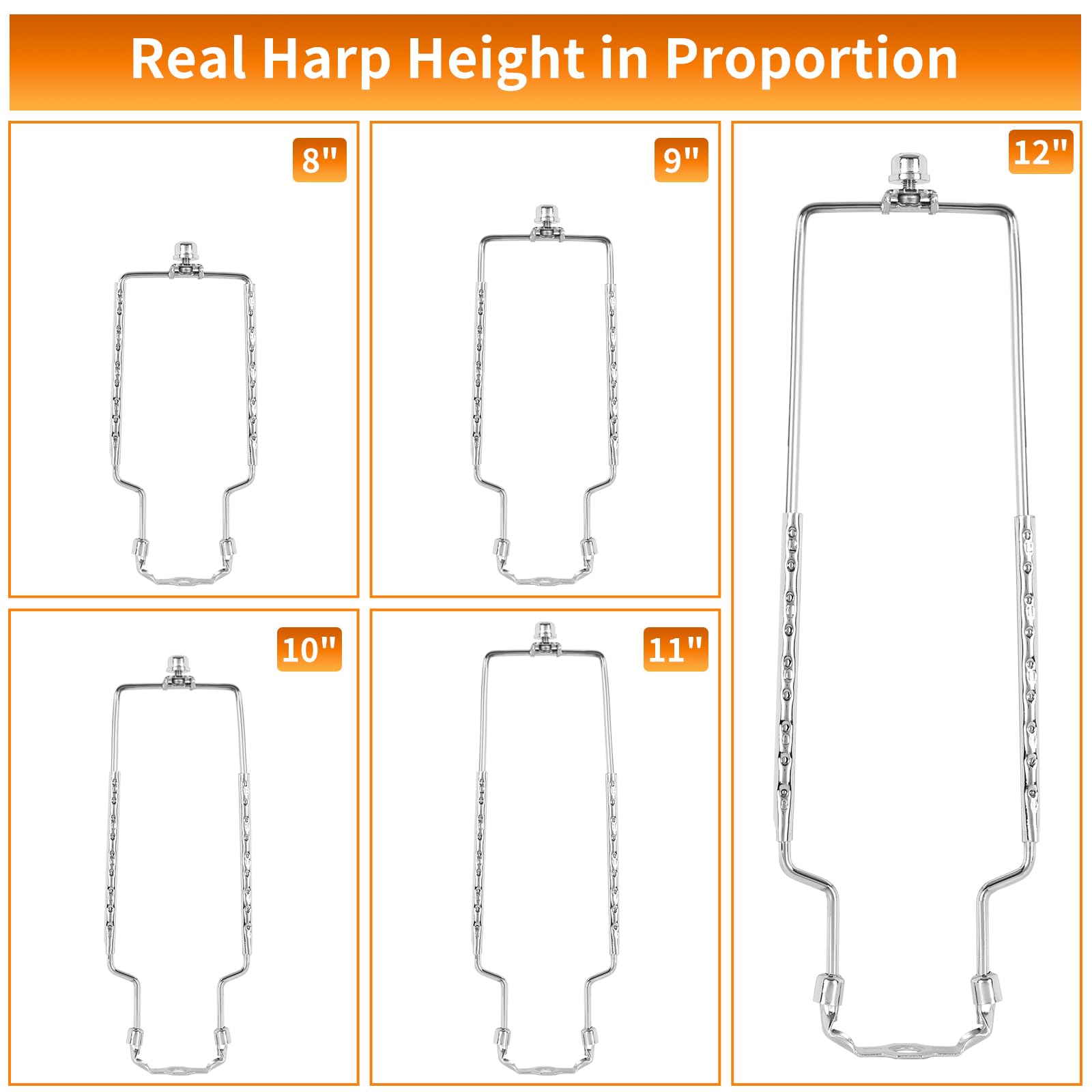 - 【PACKAGE INCLUDES】 1 Piece lamp shade harp from 8 to 12 inches level 5 adjustable tall. Various lamp head converters, E14, E26, E27. You can choose the lampshade size that best suits your installation.