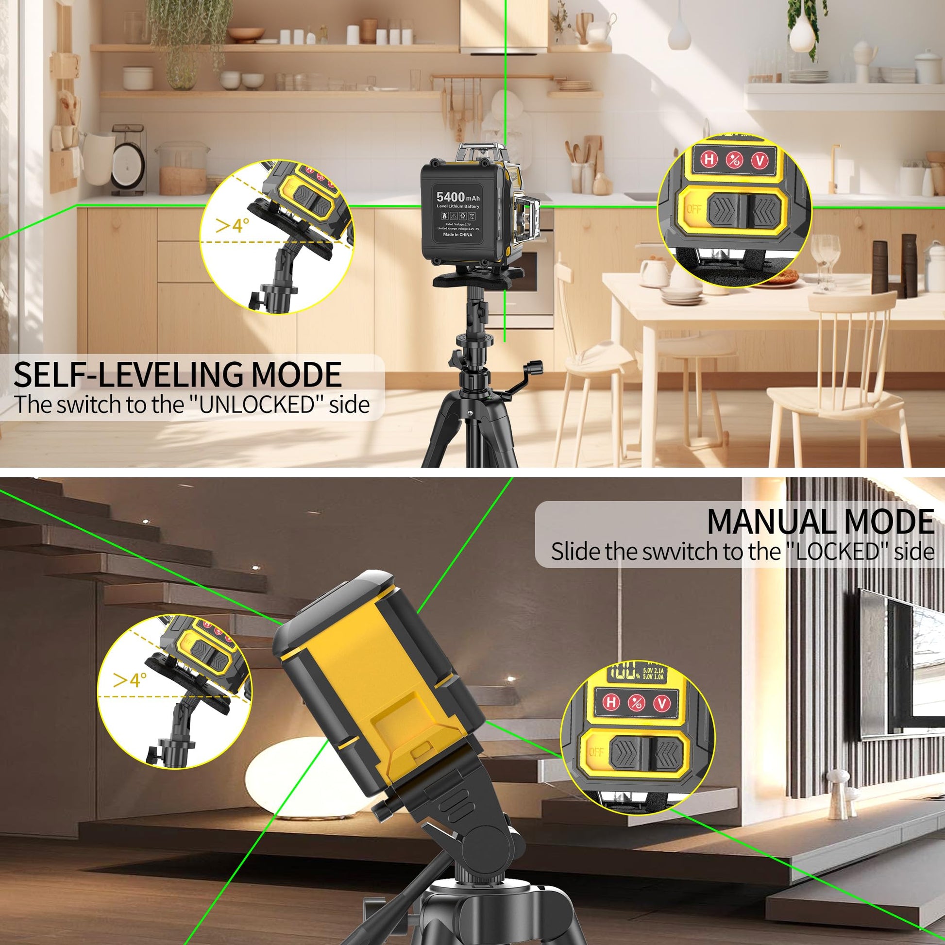 - 【Waterproof and Long Battery Life】The IP54 waterproof design protects the device from splashes, dust, and construction debris. Equipped with a 3600mAh rechargeable lithium battery, this laser level can operate continuously for 6 hours with all 16 lines fully activated.