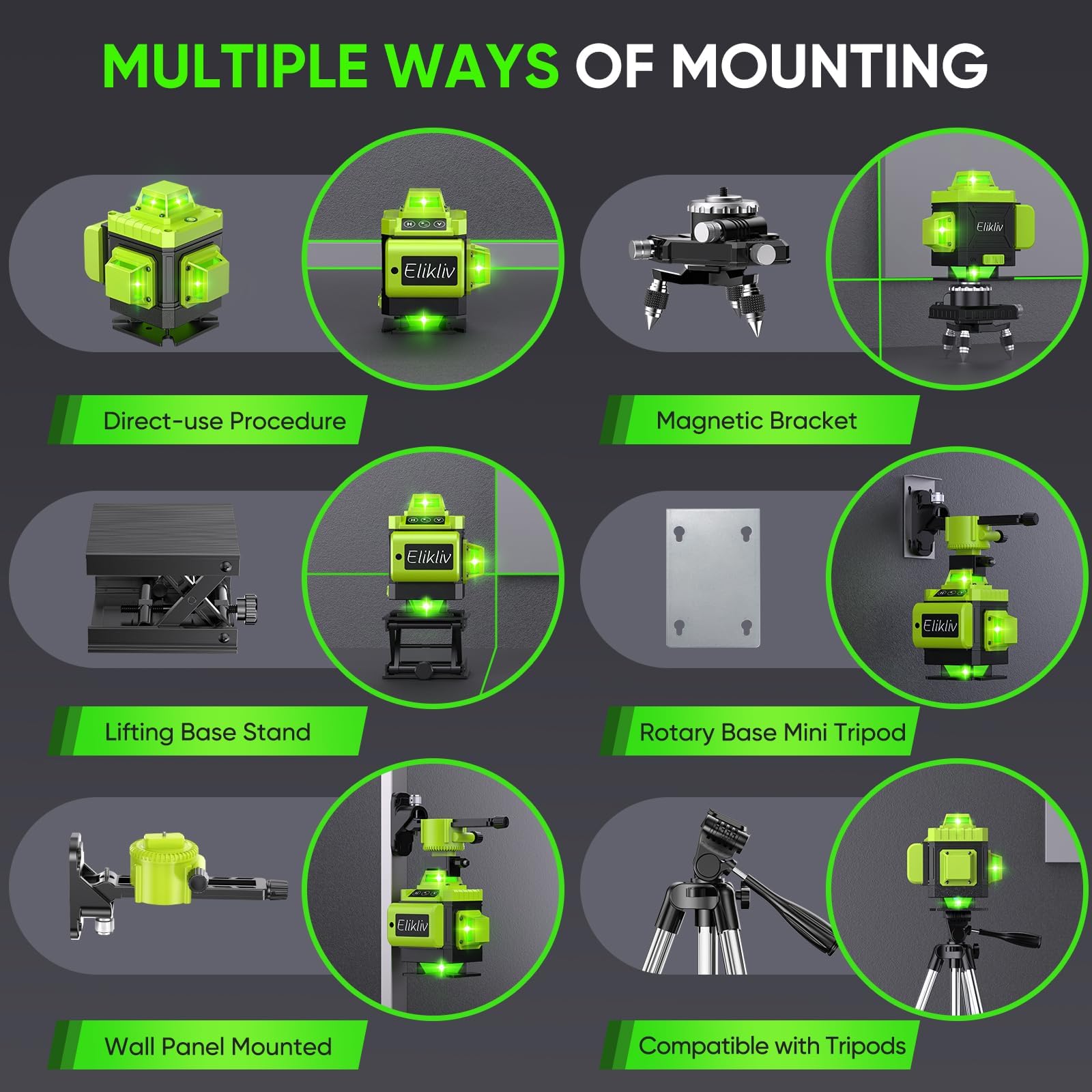 - ✅Get More from Elikliv 16 Line Laser Tool Kit✅ IP54 protection class (splash+dust protection), ideal for work on construction sites. Package list x Laser Level, 1 Lift Platform, 1 Magnetic Bracket, 2xRechargeable Batteries,1 rotary Base, 1 Remote Control, 1 x Charger, 1 Laser Target Plate,1x Green Glasses, 1 Carry Case, 1 Manual.