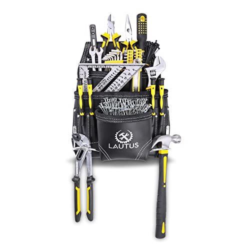 LAUTUS Oil Tanned Leather Tool Pouch Bag | Black | Carpenter, Construction, Framers, Handyman | 10 Pockets, 2 Hammer Holders | 100% Leather