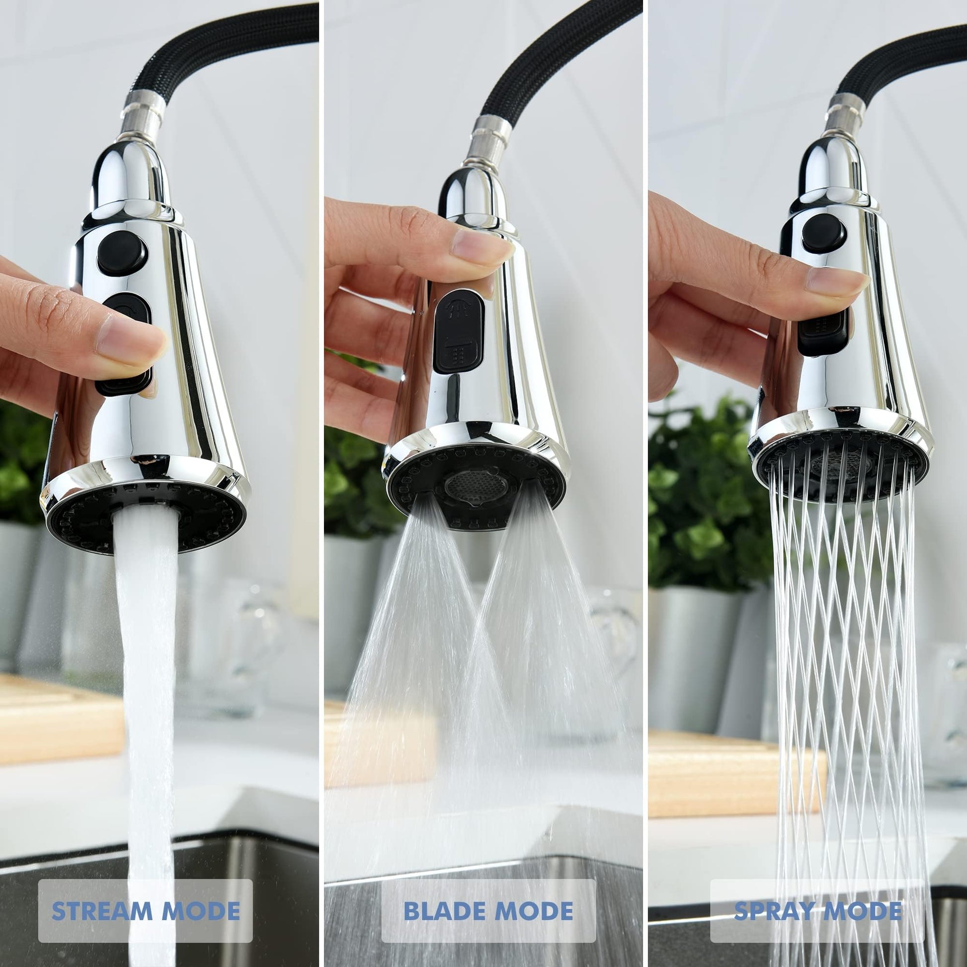 - Easily switch among stream, spray, and sweep modes. Use the aerated stream for daily fruit and veggie washing, the powerful spray for tough cleaning, and the sweep flow to clear debris and detergent