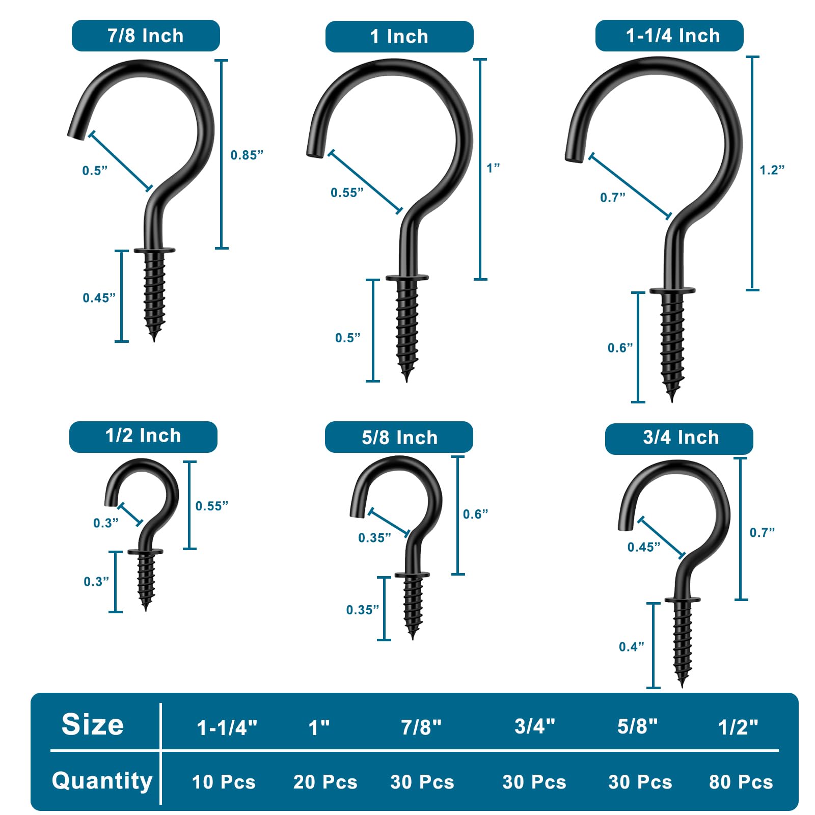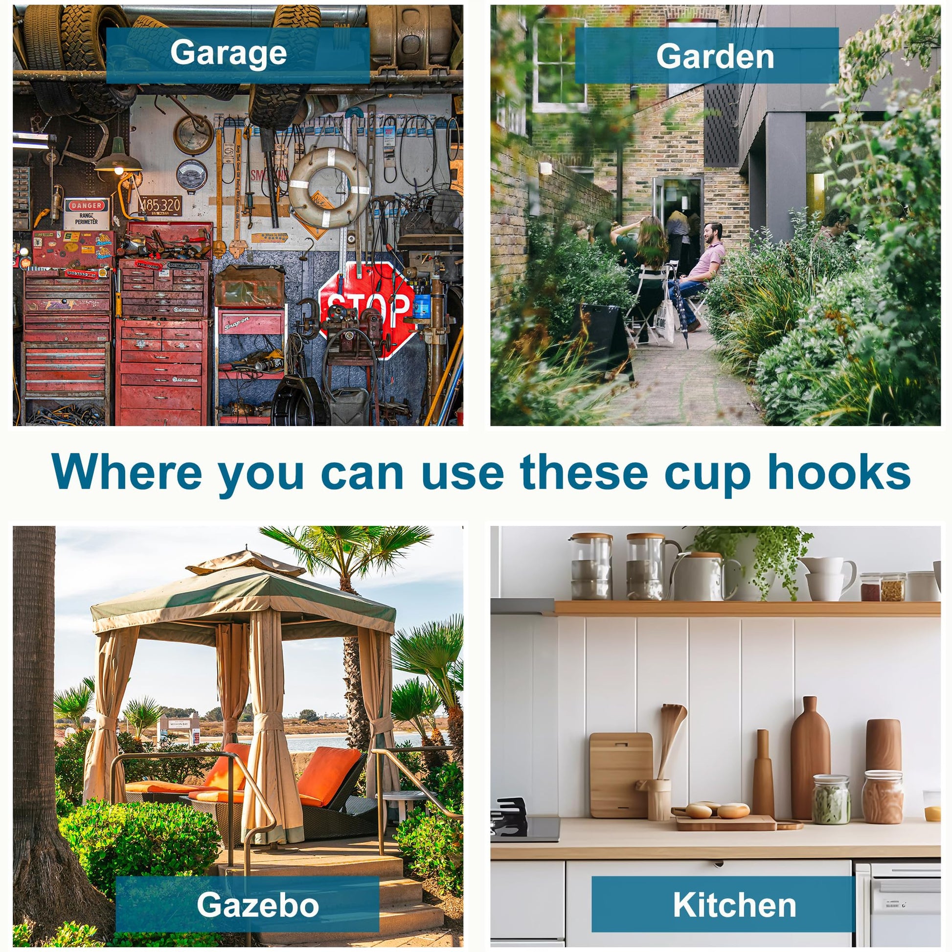 - Widely Applicable: Cup hooks design for various secens. Ideal for home repairs, professional workshops, outdoor adventures, or industrial settings, it effortlessly create extra space for the kitchen, garage, garden, storage room, school, office and any place you need, making it a must-have for hanging coffee mugs, tea cups, jewelry, plants, keys, pots, lights, curtains, bird feeders, etc.