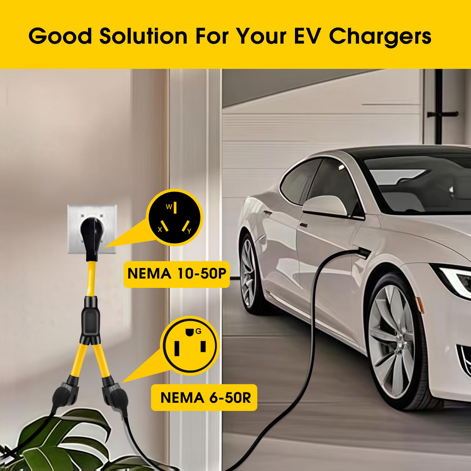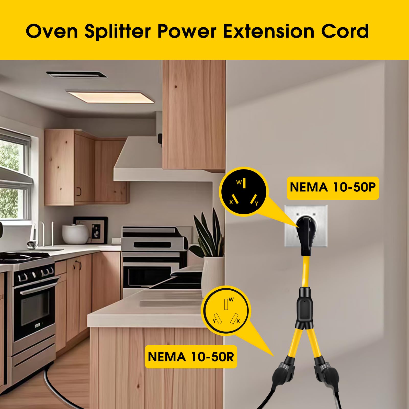 - 【50Amp Y Splitter】This 50A welder Y splitter adapter cord, features a 10-50 male plug and splits the connection into 1x 10-50R outlet and 1x 6-50R outlet, allows to power 2 devices in one source, perfect for tesla ev charging, older electric ranges, ovens, welders (Not for RV)