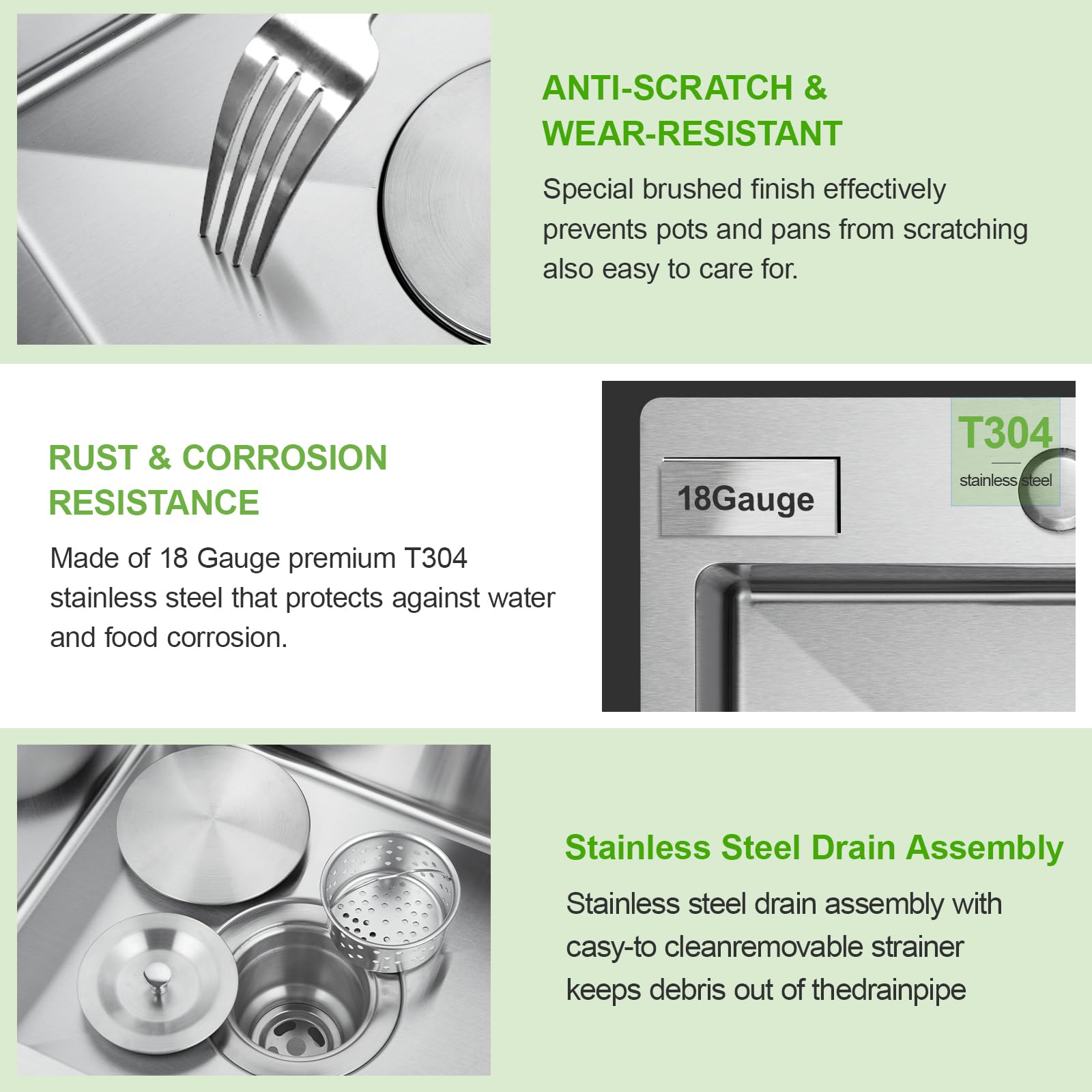 - 【Heavy-Duty 18 Gauge Stainless Steel】:Engineered with commercial-grade 304 stainless steel, the brushed finish naturally resists scratches and corrosion—perfect for high-traffic rv kitchen sink use without artificial coatings.