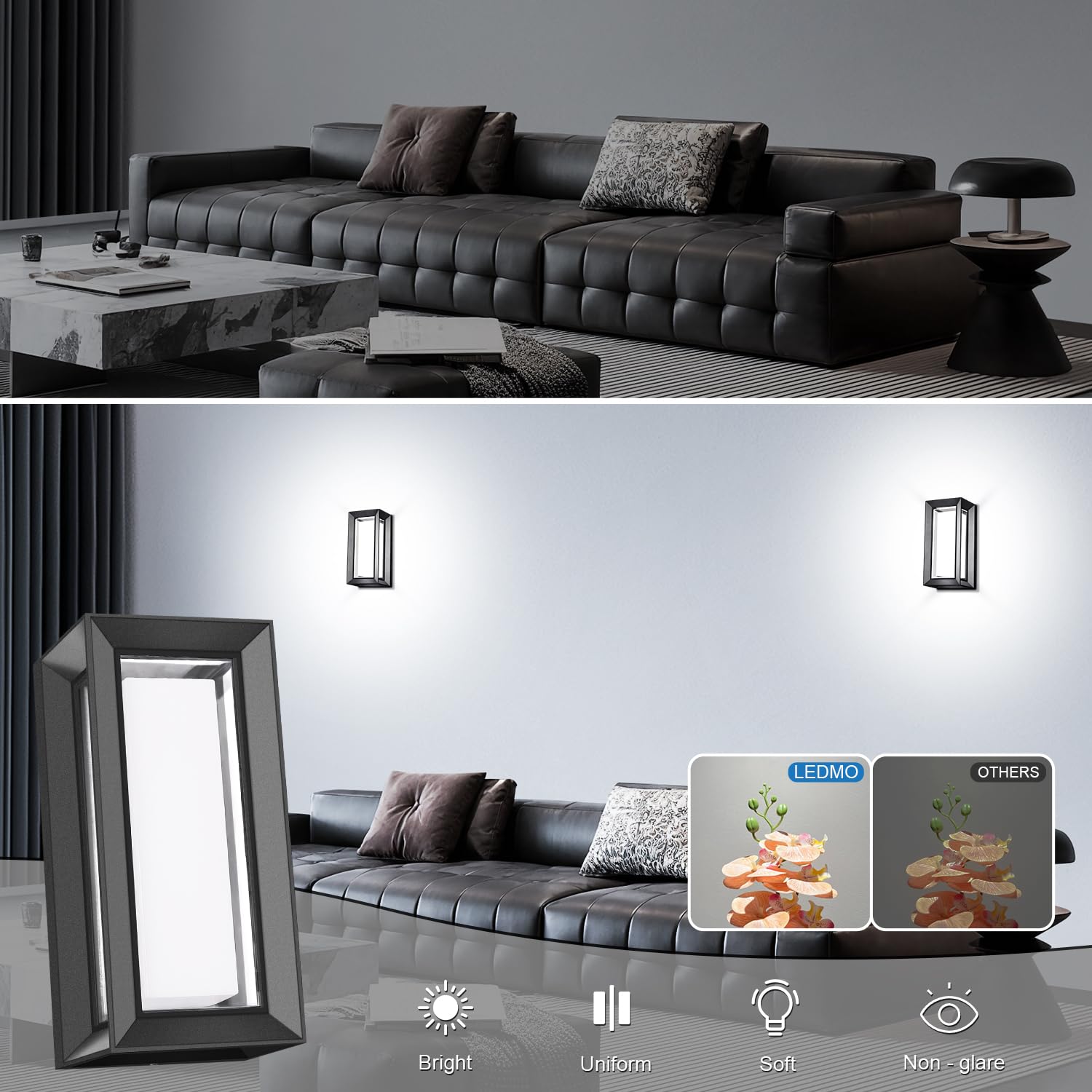 ledmo Outdoor Wall Lights 1800Lm Modern Outdoor Porch Light 6000K Bright Lighting Black Exterior Lighting Fixture Waterproof Christmas Fixture for House,Patio,Garage,Backyard,Hallway (2 Pack)