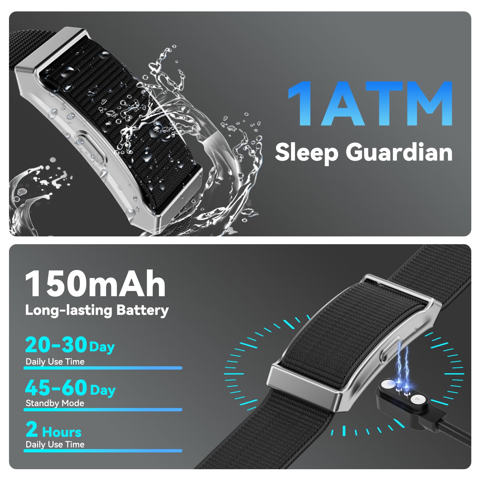 - 【Extended Battery Life & 1ATM Waterproof】The Smart bracelet is equipped with large capacityand low power consumption battery. Low power consumption design allows 30-45 days of use on a2-hour charge. The health tracker bracelet features an 1ATM water resistance protects against sweat and rain, meeting daily and workout waterproofing needs