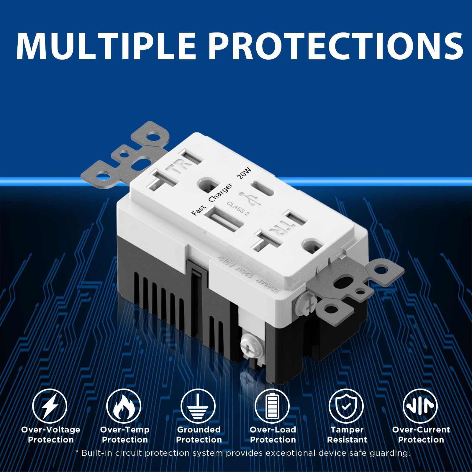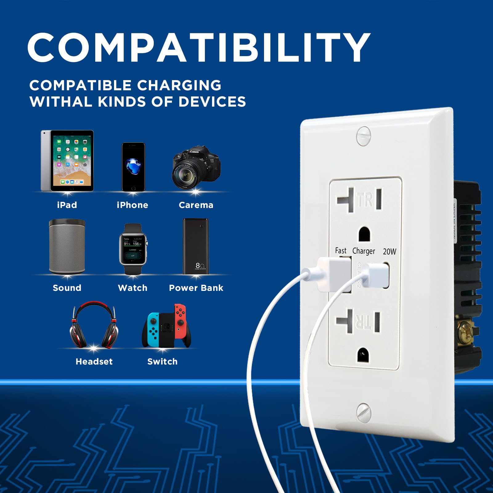 Details: LGL USB C Charger Wall Outlet, 20W Fast Charging USB A & USB C Port Wall Receptacle, 20Amp 125 V Duplex Tamper Resistant Receptacle, ETL Listed, Wall Plate Included, White