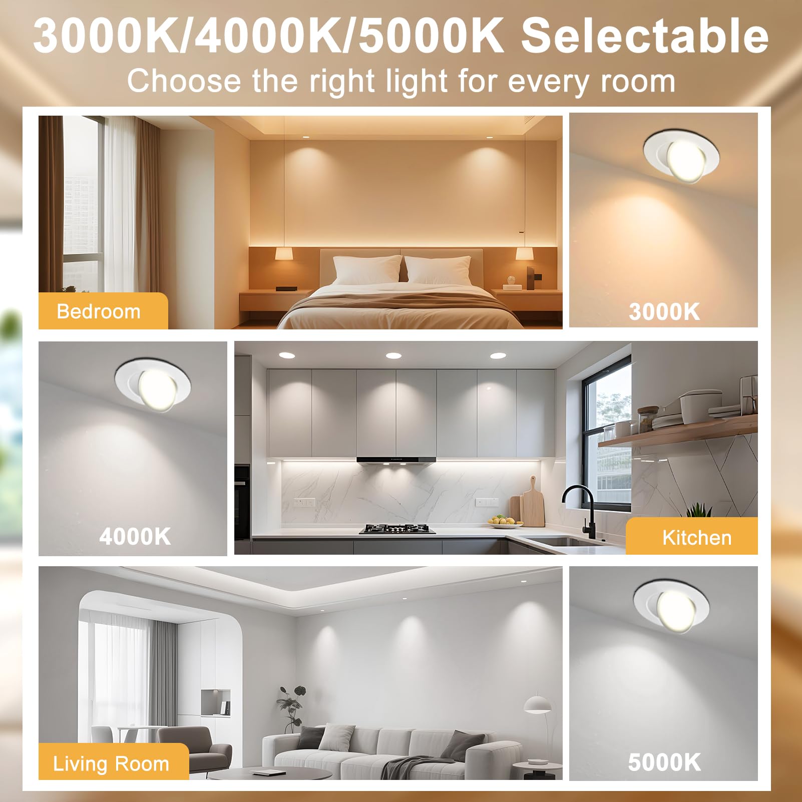 - 3CCT + Smooth Dimming💡This canless lighting is multi-function. With a CCT switch, 3000K, 4000K and 5000K can be selectable. 6 Inch LED eyeball light can dim from 5% to 100%—create cozy evenings or vibrant workspaces with a single touch your dimmer switch.