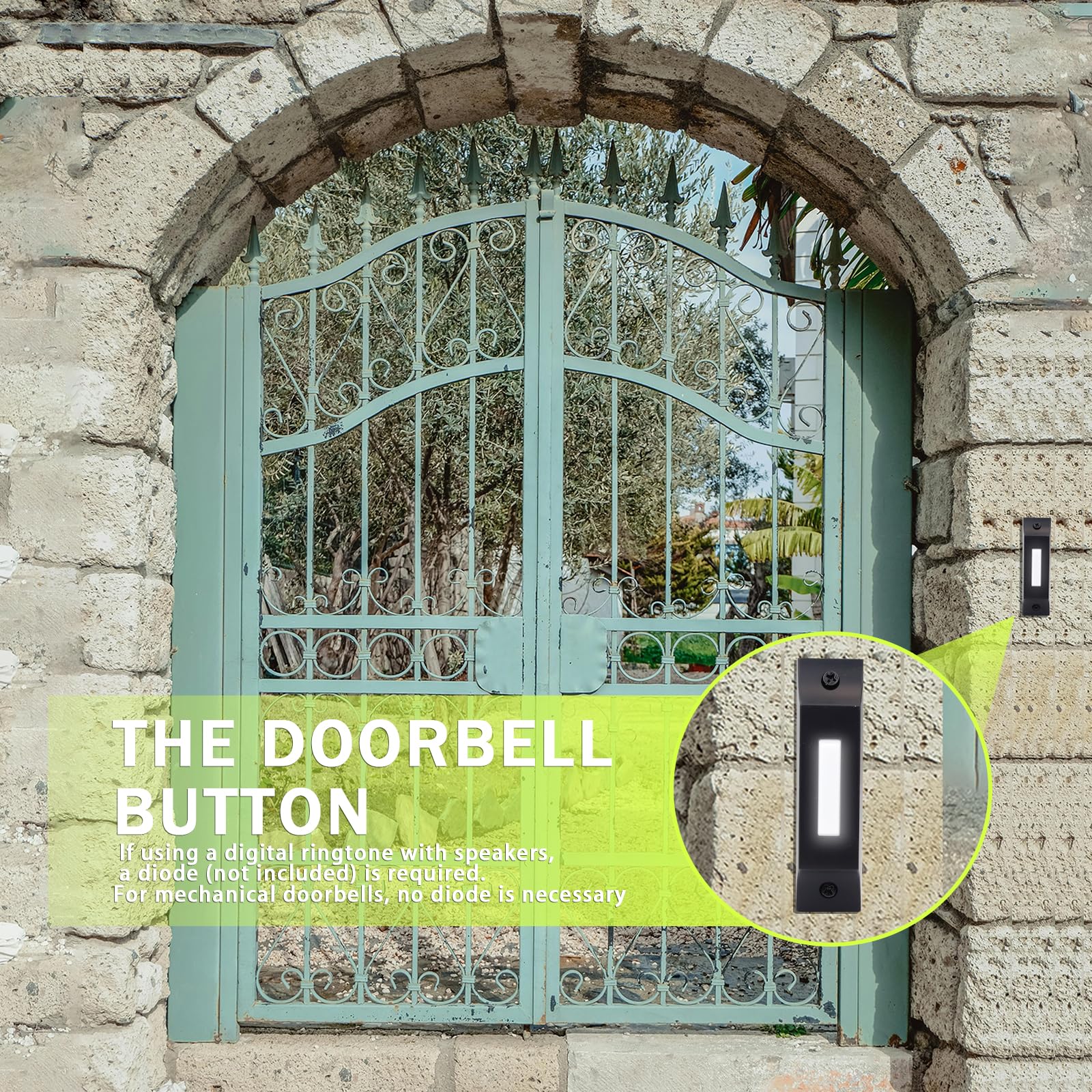 - Compatibility with: This door bell button works with wired doorbell systems that operate at 8-24V. For digital ringtones (melodic sounds), diodes are required (not included). If using a mechanical bell with a two-note sound, no diodes are needed, making it perfect for a wide range of doorbell button wired systems