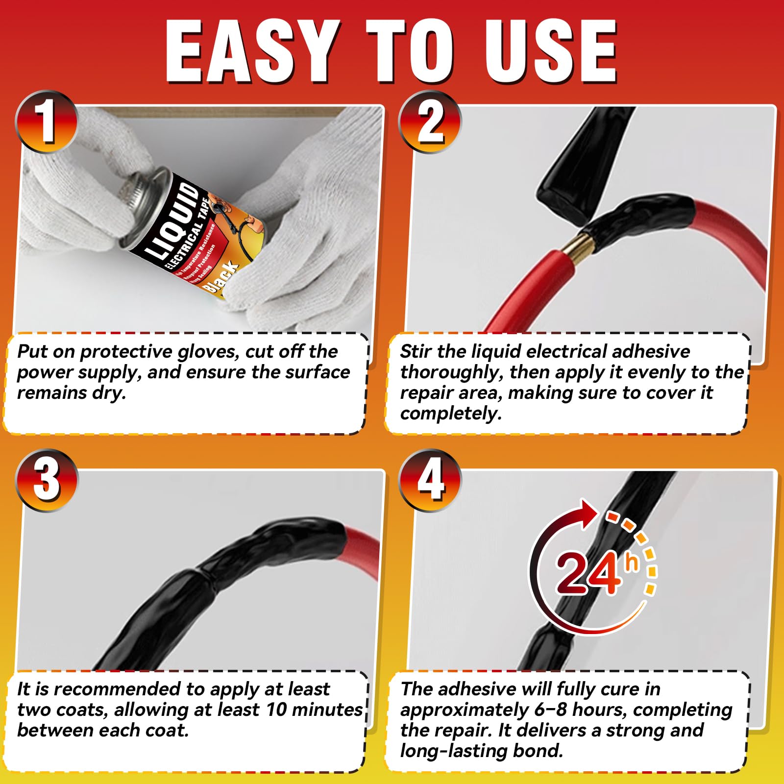 - Easy Brush-On Application: No Hassle, No Mess. Forget the struggle with conventional tape on irregular surfaces and complex shapes. Our Liquid Electrical Tape applies easily with a brush, just like paint. It creates a smooth. professional-grade seal over wire splices, connectors, terminals, and hard-to-reach spots—no special skills required