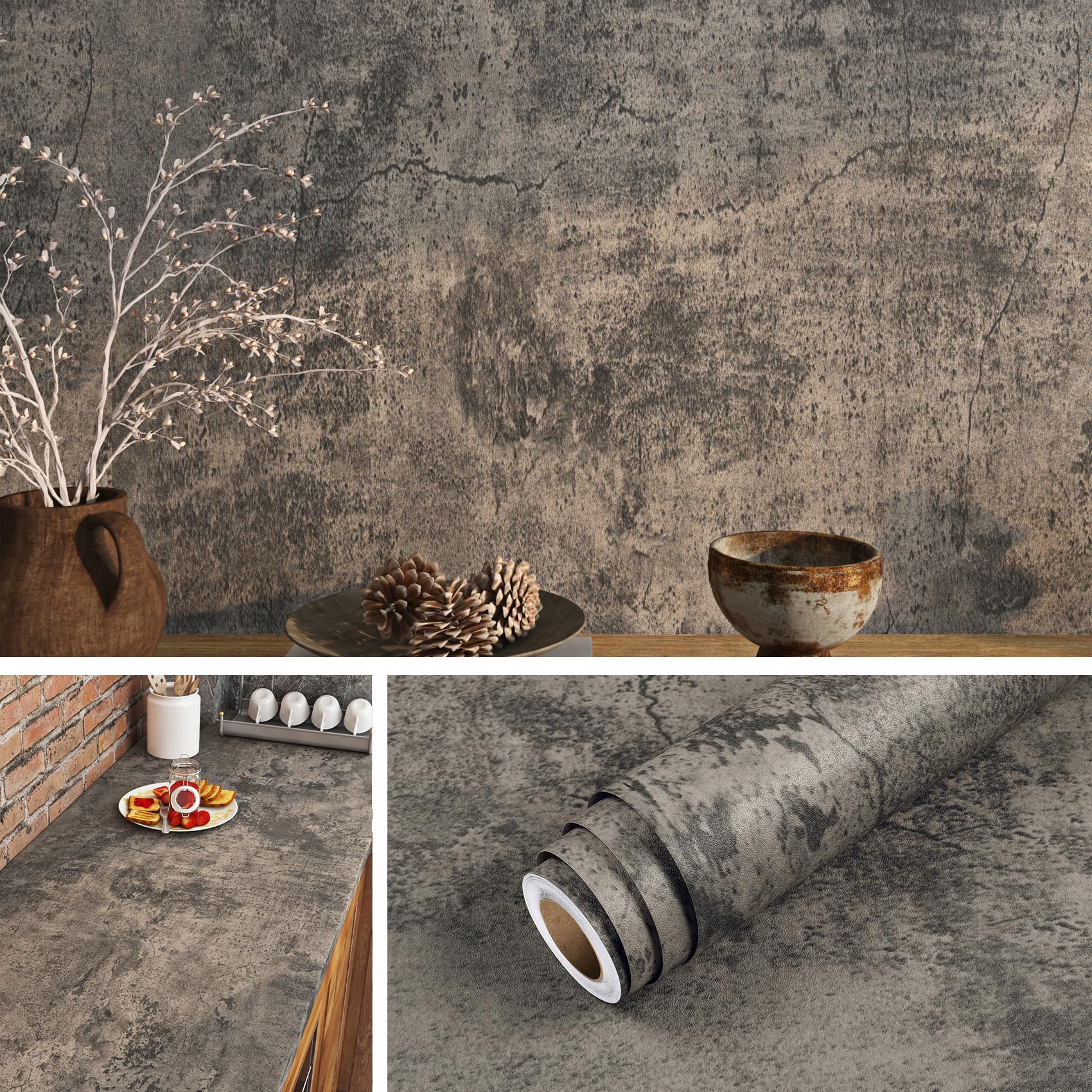 Livelynine Moody Concrete Wallpaper Peel and Stick Industrial Modern Brown Black Limewash Wallpaper Waterproof Dark Aged Cement Wall Mural Removable Cracked Concrete Contact Paper Vinyl 15.8x78.8