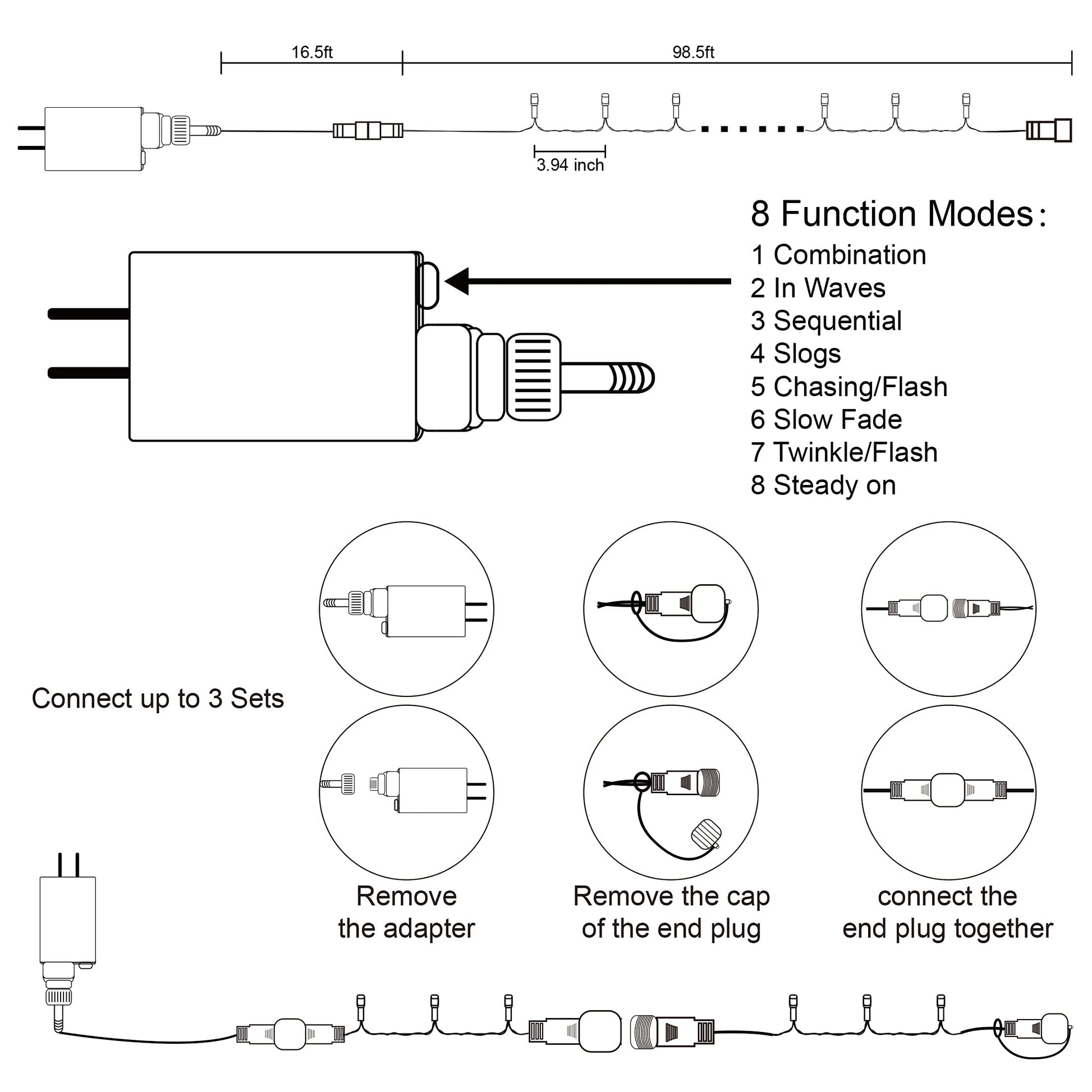 - 8 Lighting Functions with Memory Function: Our Christmas string lights have 8 lighting modes- combination, in waves, sequential, slogs, chasing/flash, slow fade, twinkle/flash, and steady on. Just pressing the round button on the transformer to change the lighting modes. Comes with memory function, will remember last setting automatically after cutting off the power, no need to reset again