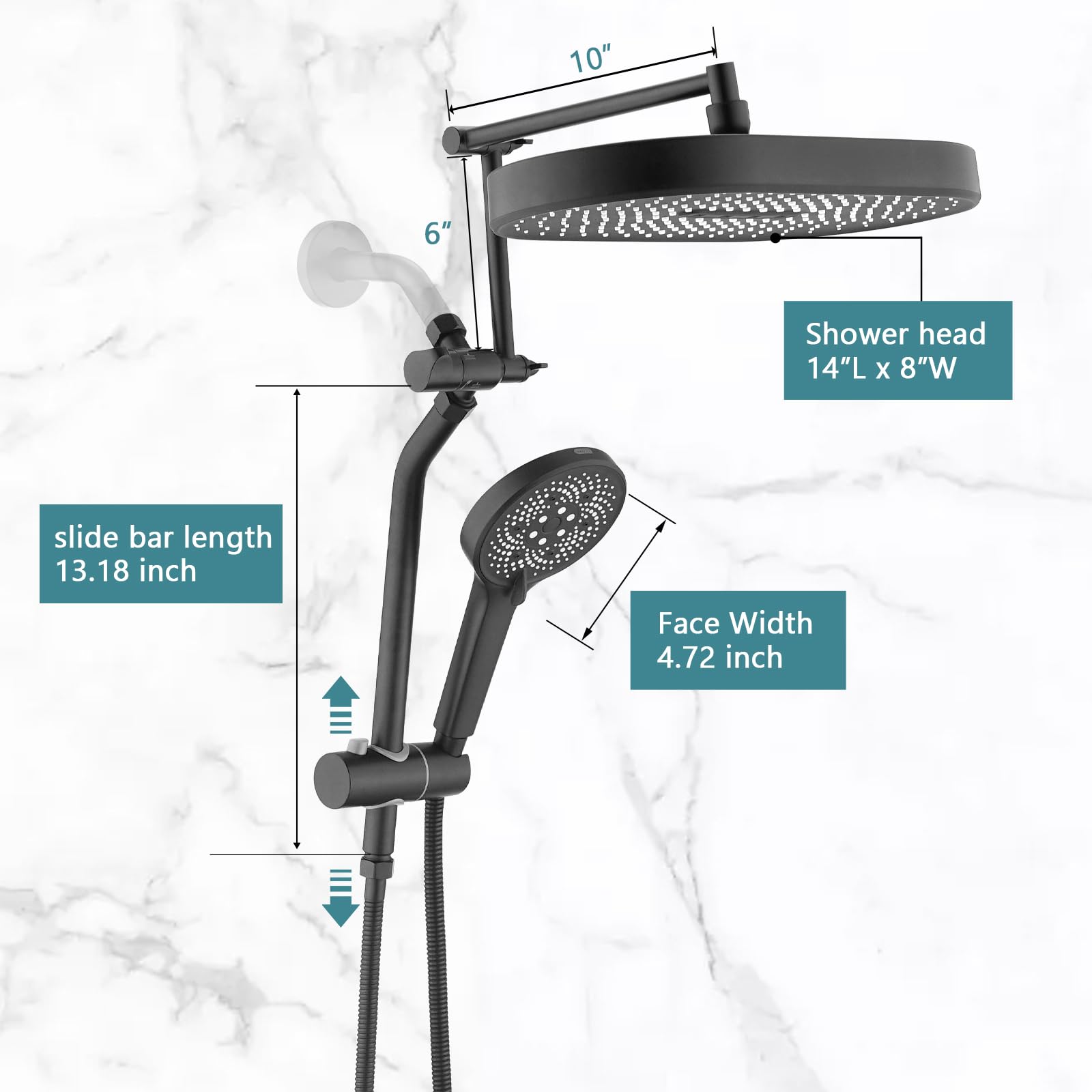 LOCALAND 14" x 8" Rectangle High Pressure Rainfall Shower Head with Handheld Combo, 6 Setting Handheld Shower Head, Adjustable Height Shower Extension Arm and Slide Bar for Easy Reach - Matte Black