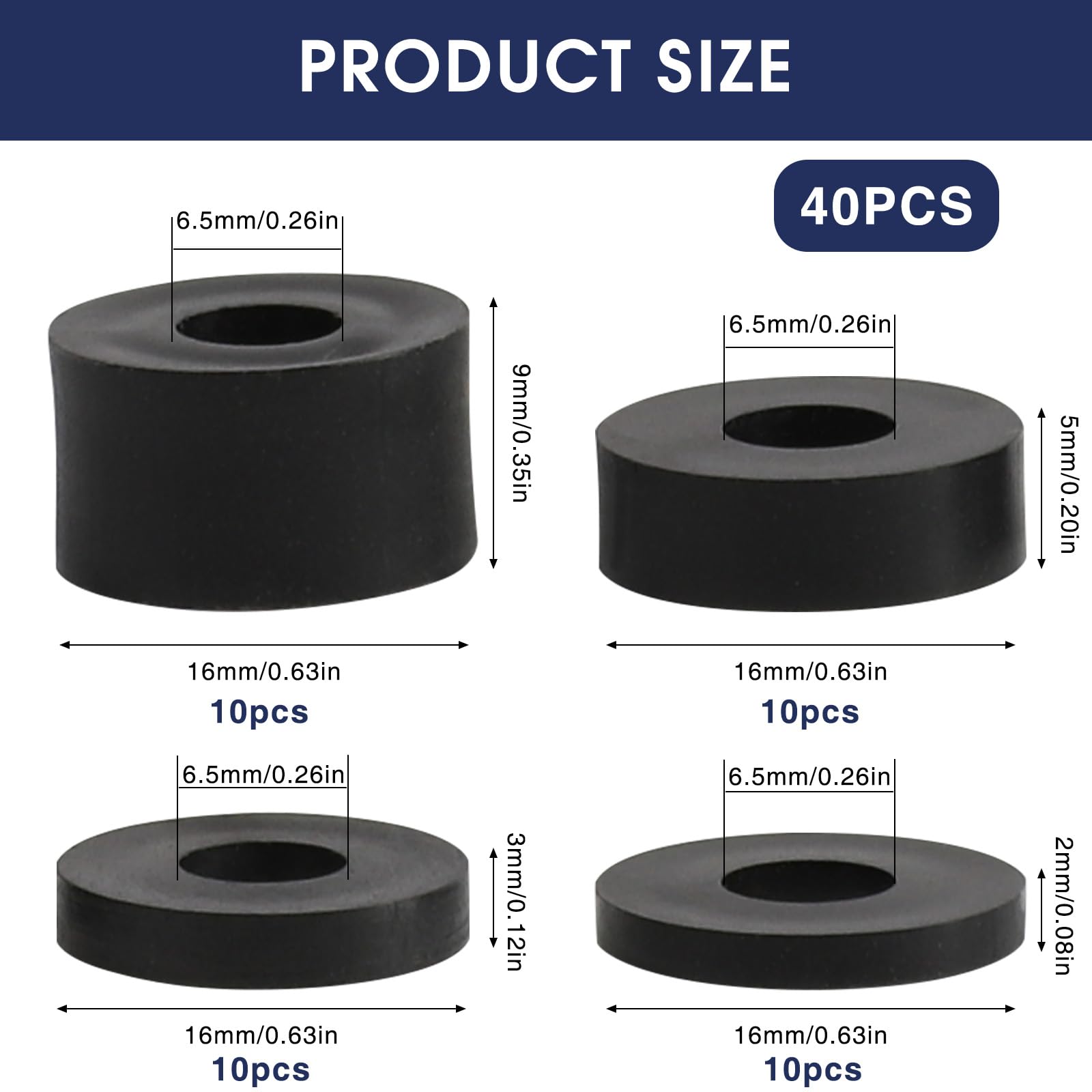 - Product Dimensions: 4 sizes included: 16*6.5*2mm, 16*6.5*3mm, 16*6.5*5mm, 16*6.5*9mm. Total 40 rubber washers—sufficient for daily household repairs and replacements