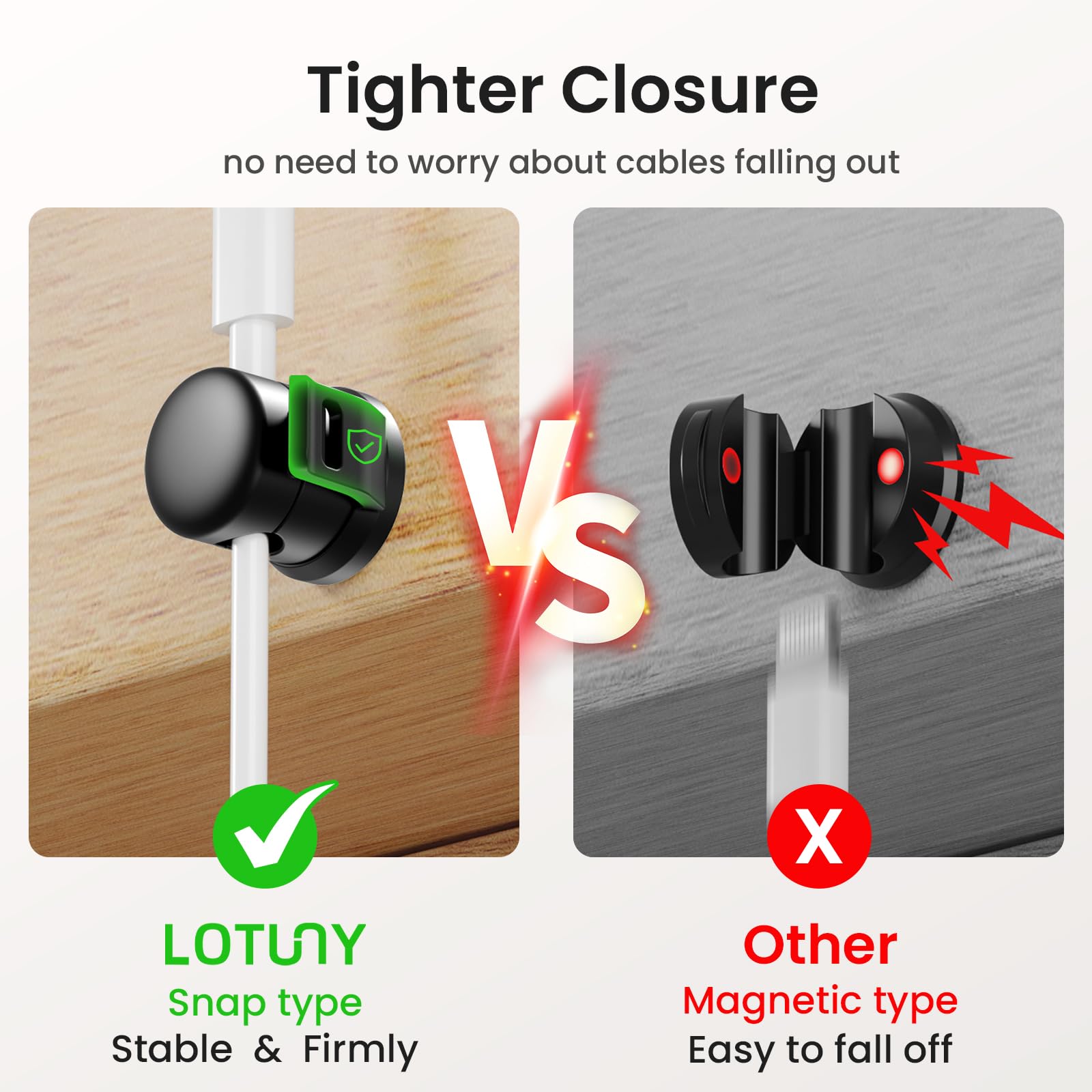 - Keep Cable Tidy: Say goodbye to messy and unsightly cables! LOTUNY cord holder keep your cords neatly organized, creating a clean and clutter-free environment. 8 pack cable clips meet your needs for multiple applications, such as: desktop, side table, under the table, kitchen, car and more!