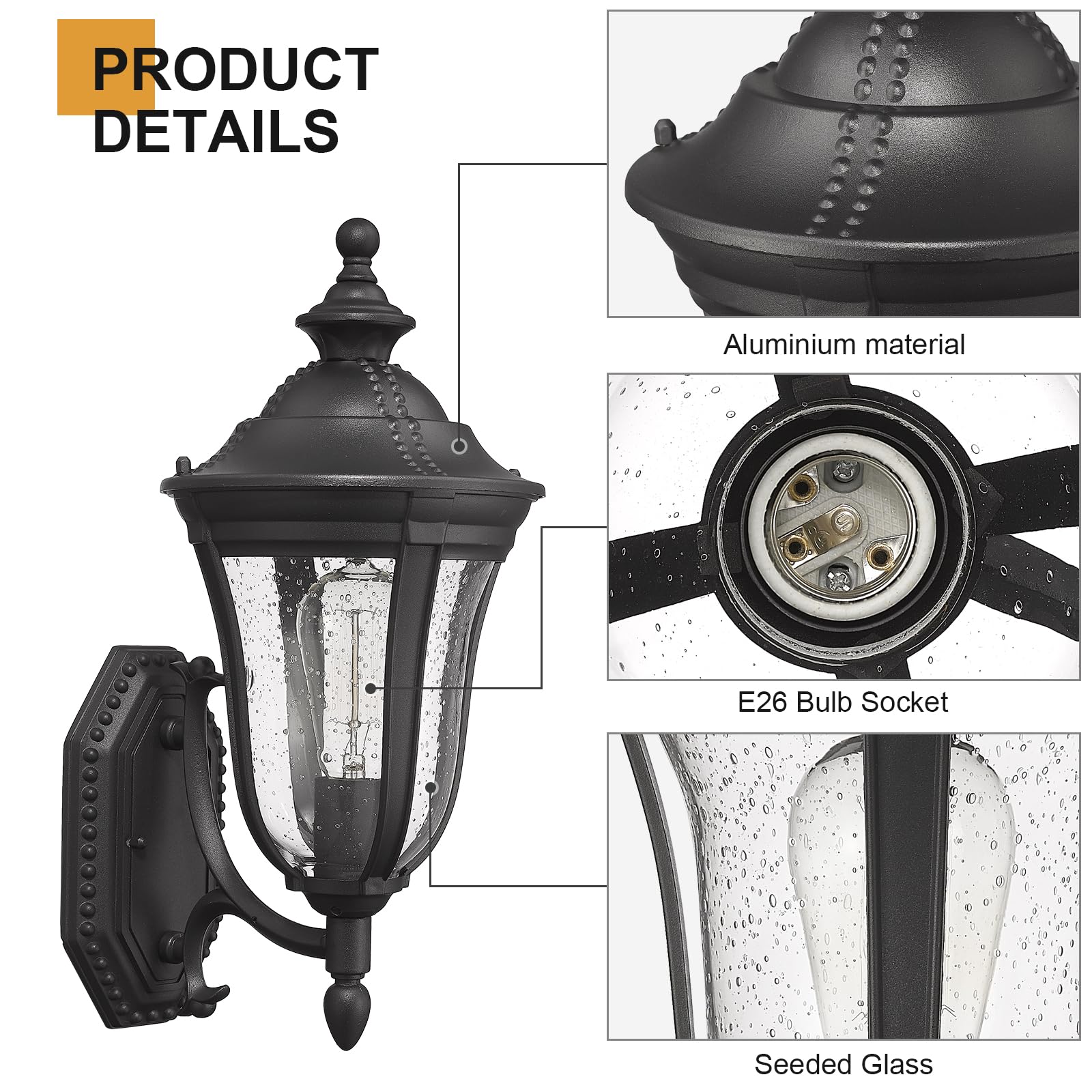 - 【BEST FOR OUTDOOR DECORATION】The best exterior porch lights wall mount illuminate your house. A combination material of aluminum and seed glass, the appearance is a lily basket upside down design, which can add style to your outdoor space. This style of outdoor wall lanterns is suitable for balconies, porches, corridors.