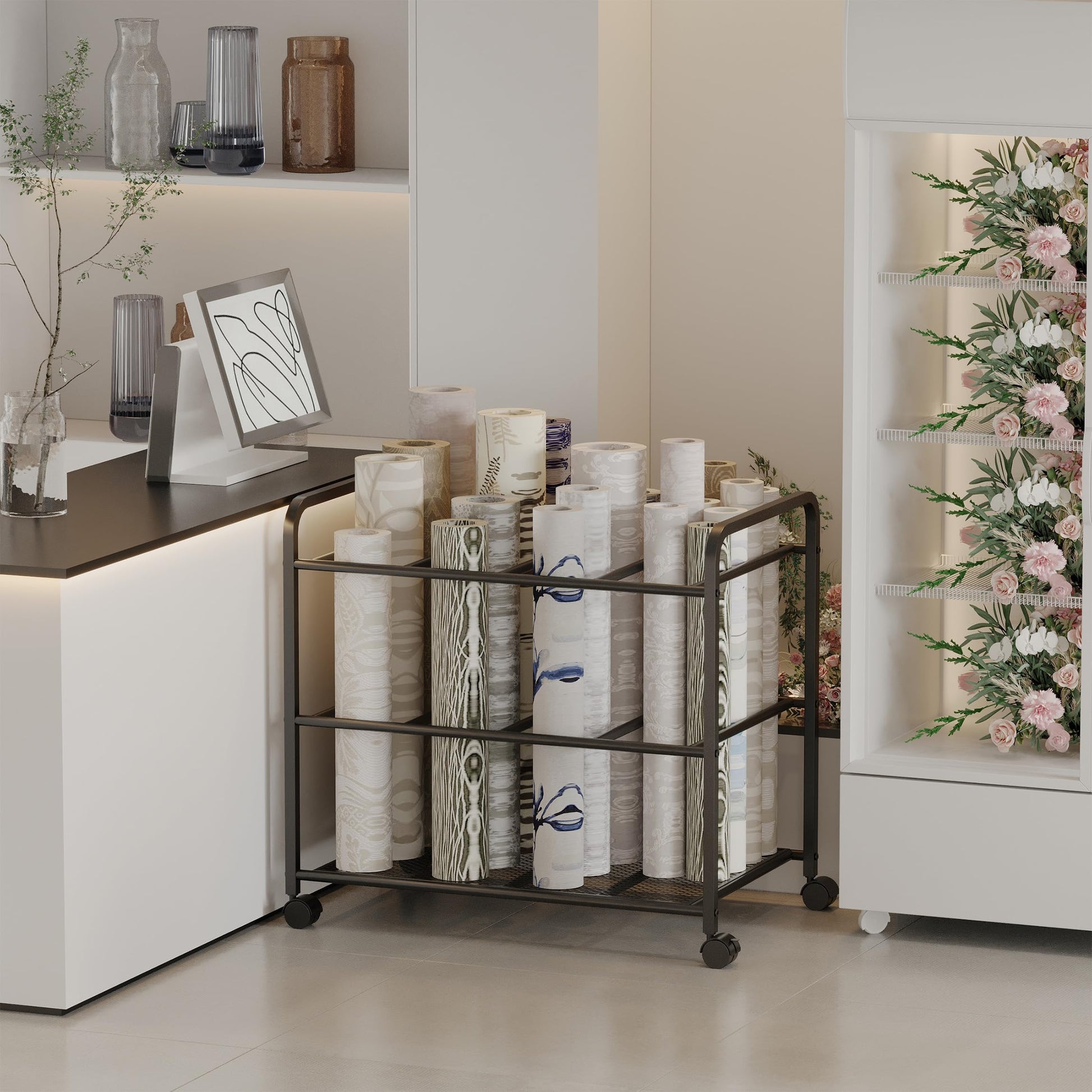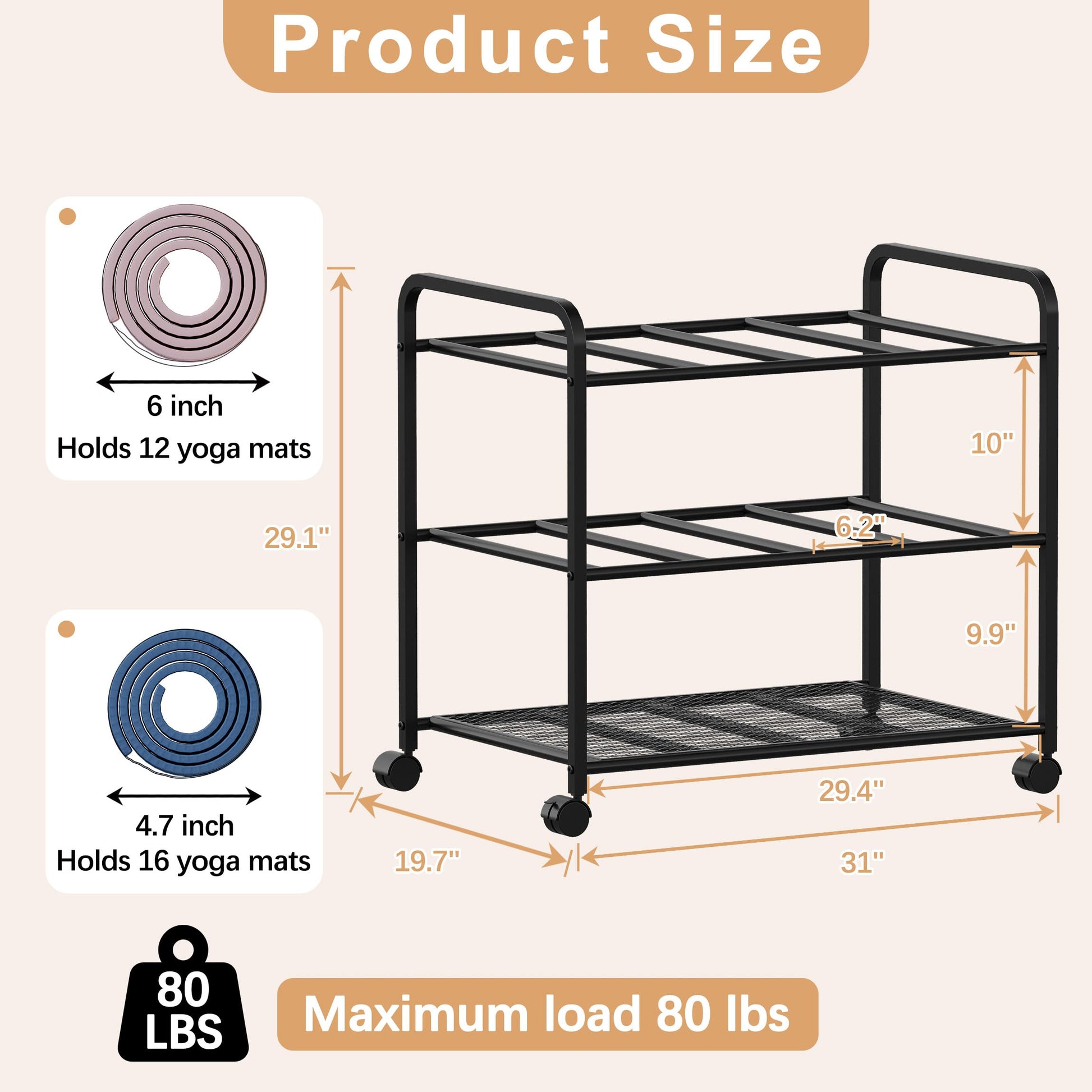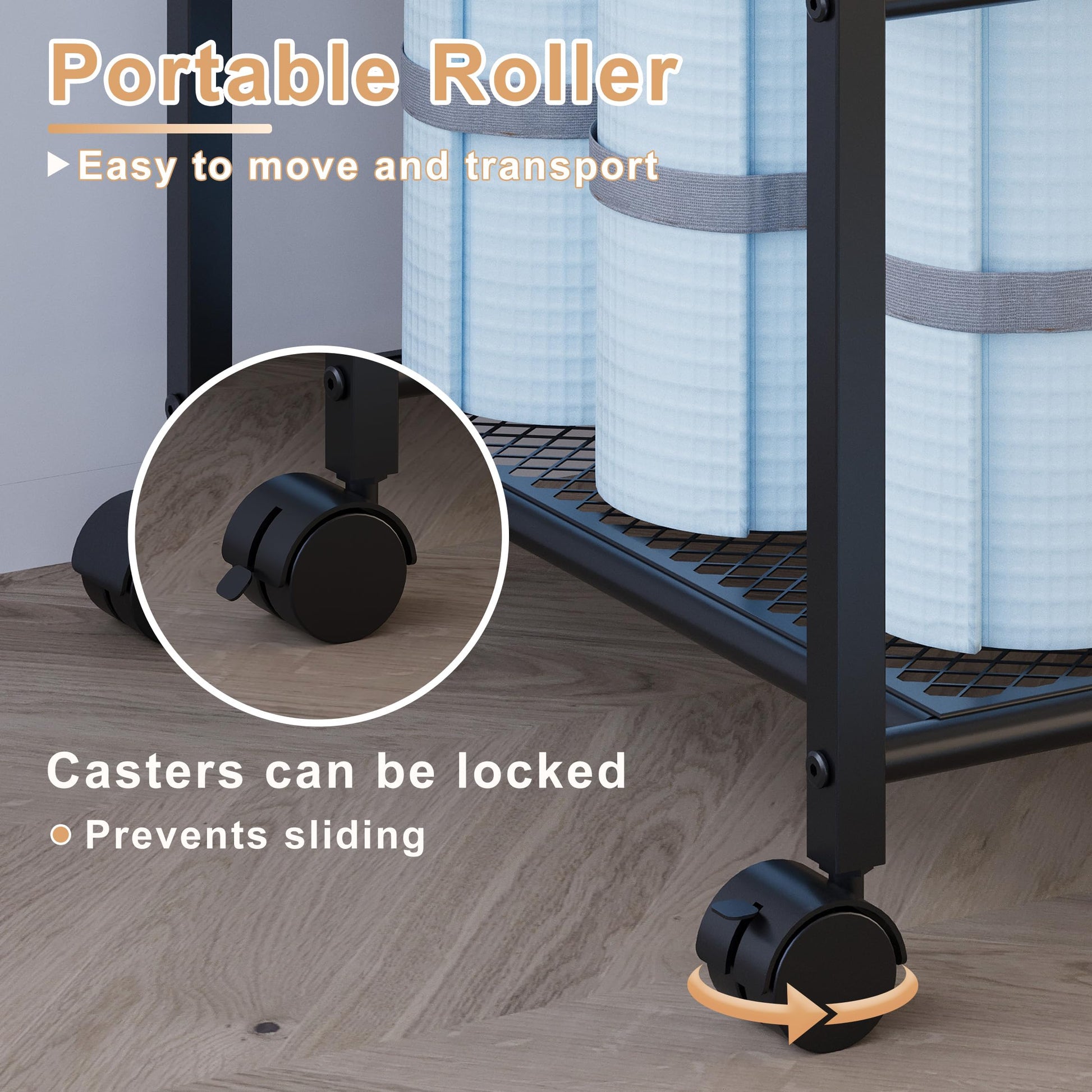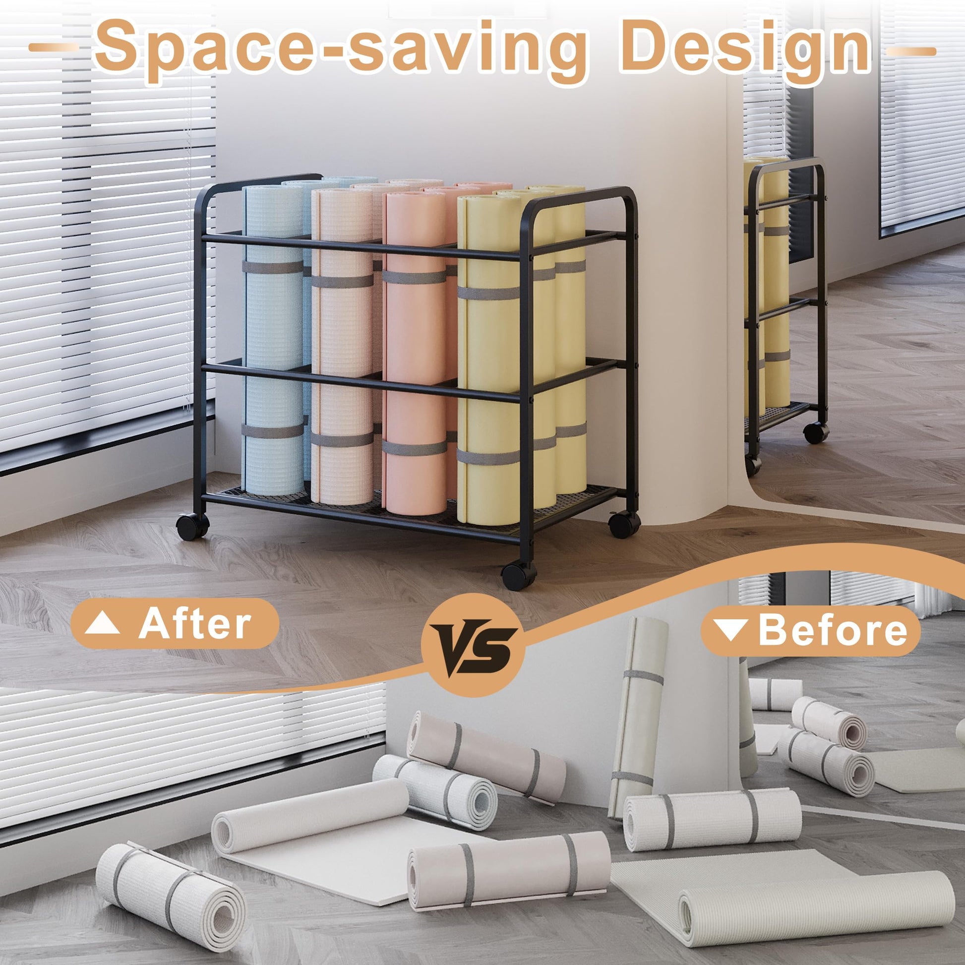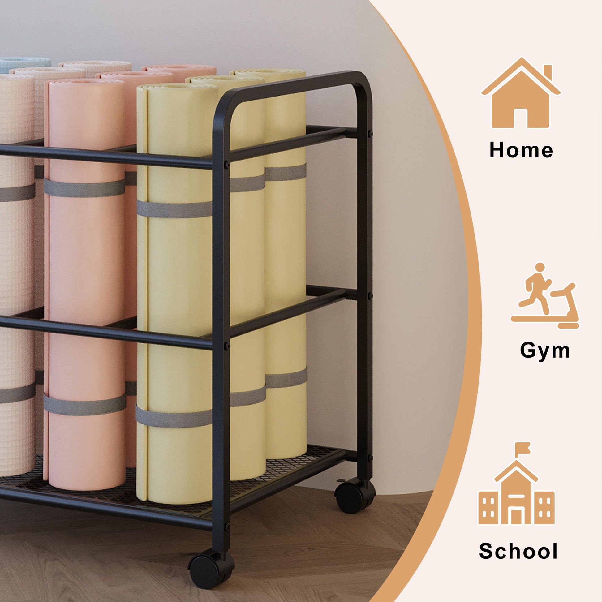 - Portable Lockable Casters: Fitted with four 360° smooth-rolling castors, the lockable design ensures the yoga mat organizer is just as easy to move as to keep in place.