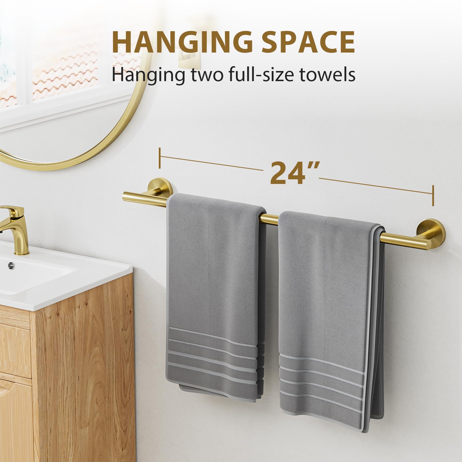 - 【Ideal Hanging Length】The 24 inch hanging length is perfectly suited for two full-size towels and is designed to fit with 24 inch wall studs. The 3 inch distance from the wall facilitates quick and effective towel drying.