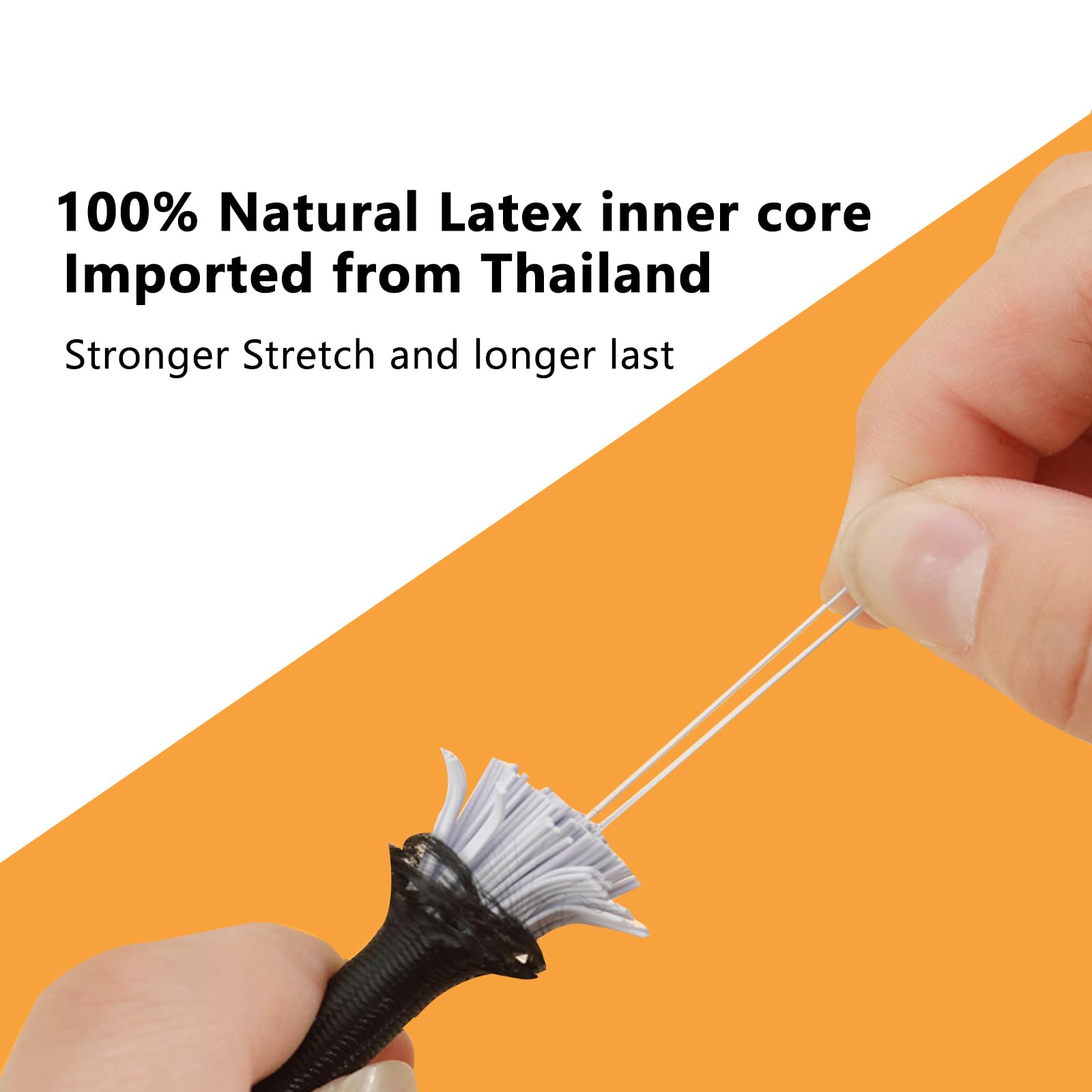 - SUPER STRETCHY CORE: This bungee cord core made of 100% natural latex rubber .Made with first extruded latex rubber for consistent 100% stretch and high modulus. it can provide higther stretch and longer lasting than other bungee cord.