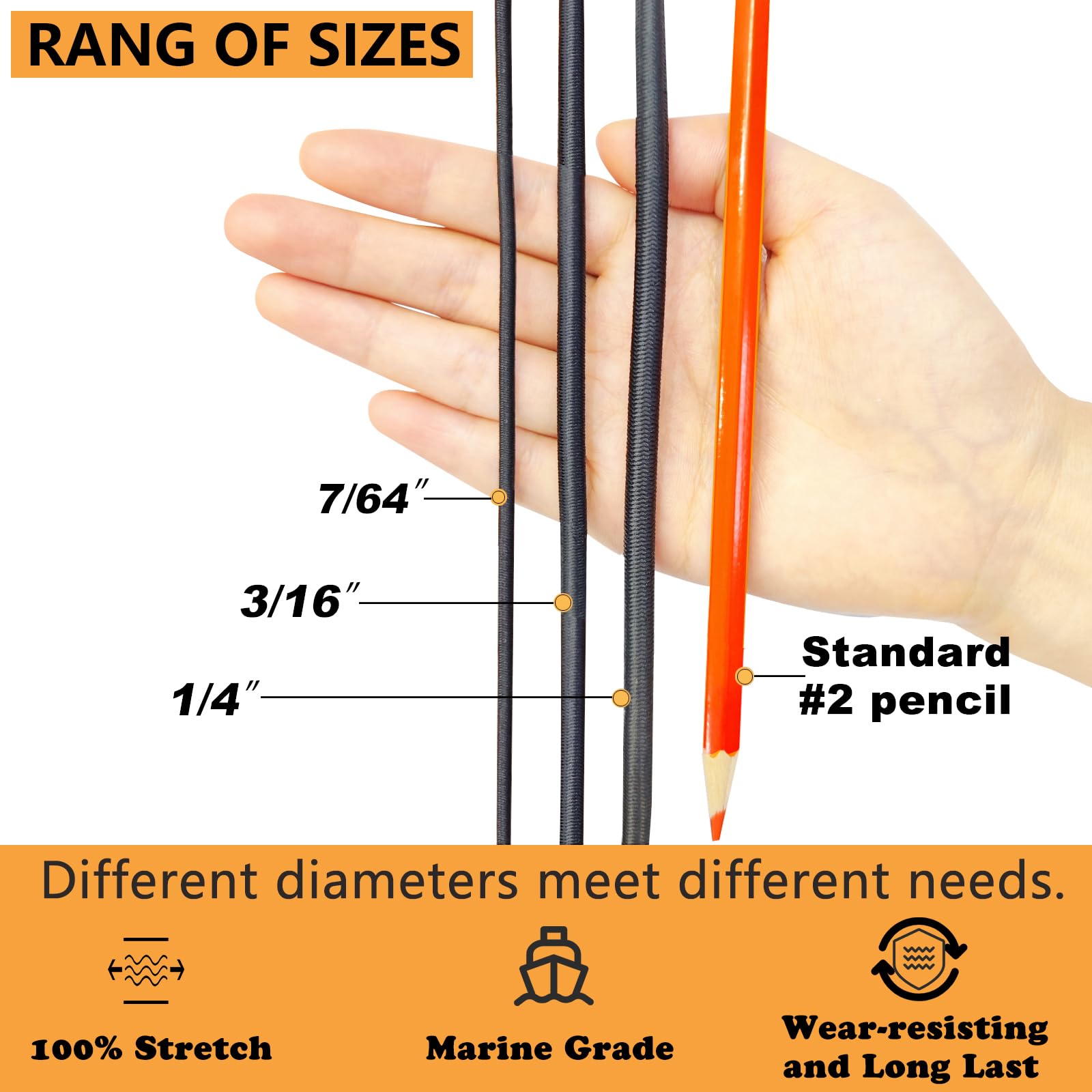 - CONVENIENT PACKING: We specially pack elastic cord in 16' (5m),32' (10m)bundle and 65' (20m), 100' (30m) spools so that you can conveniently cut and use it. There are diameters of 7/64"(2.8mm),3/16"(5mm),1/4"(6mm) to choose from. Various colors and sizes help you choose the right one for your projects.