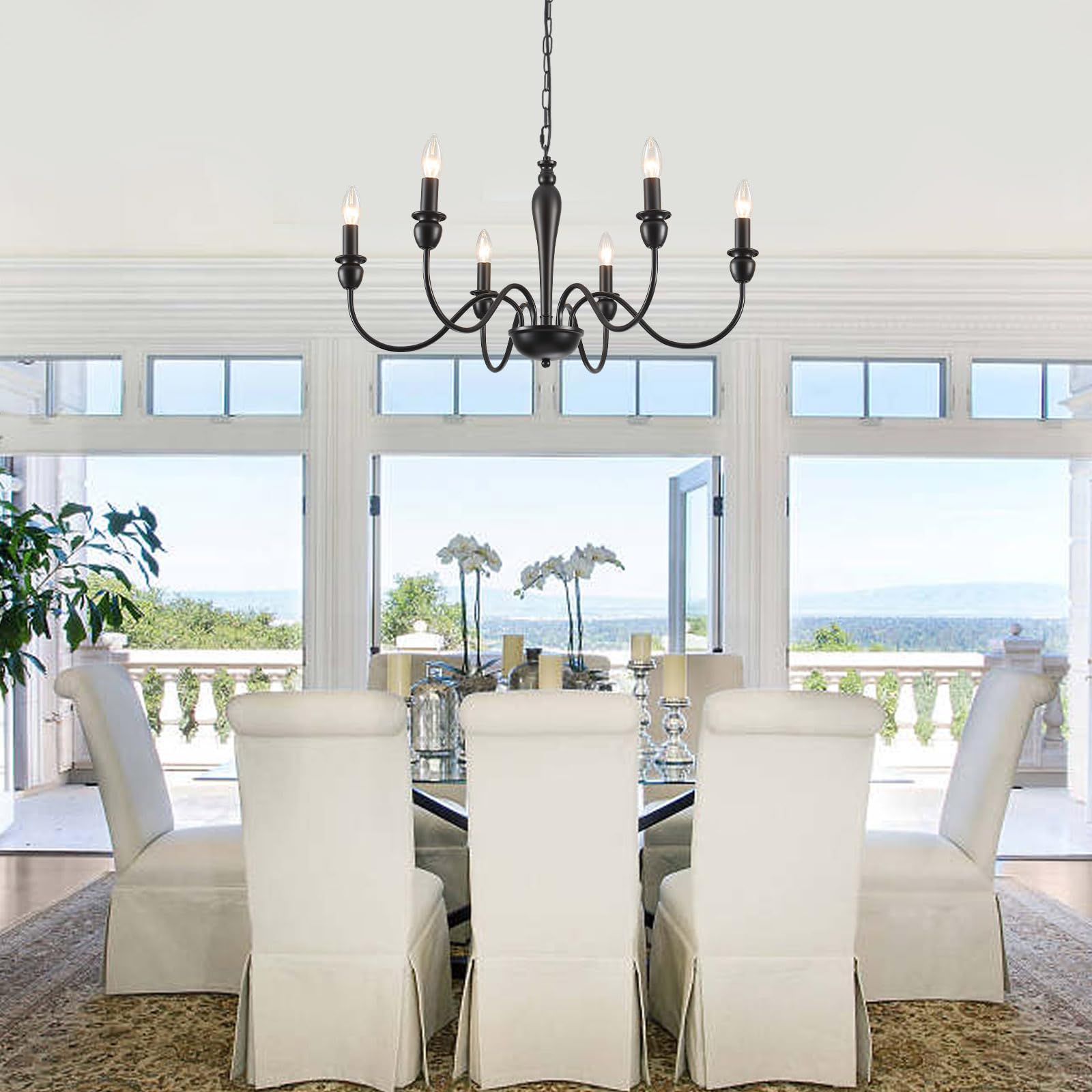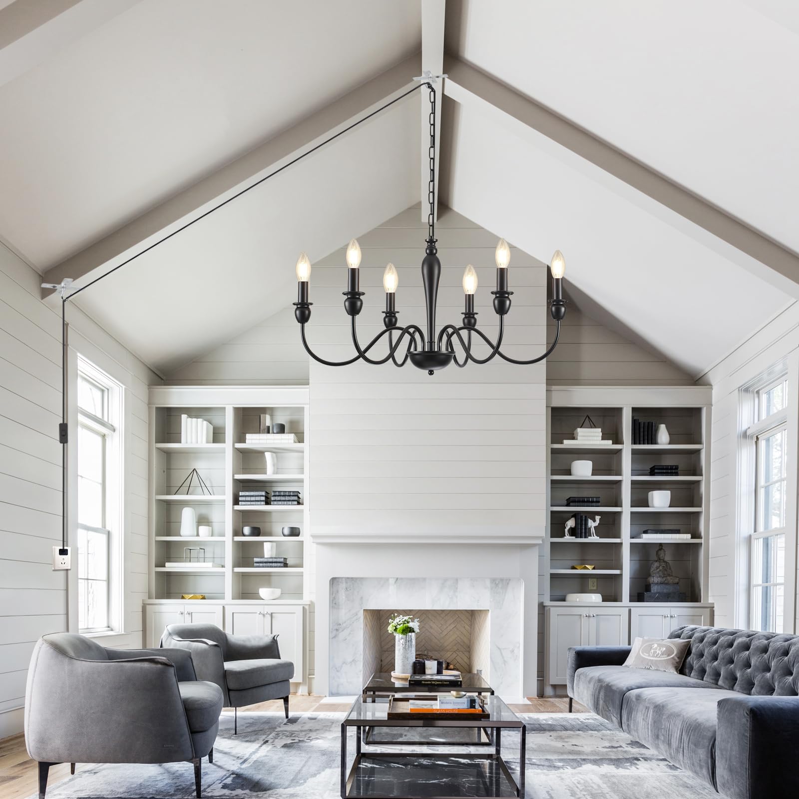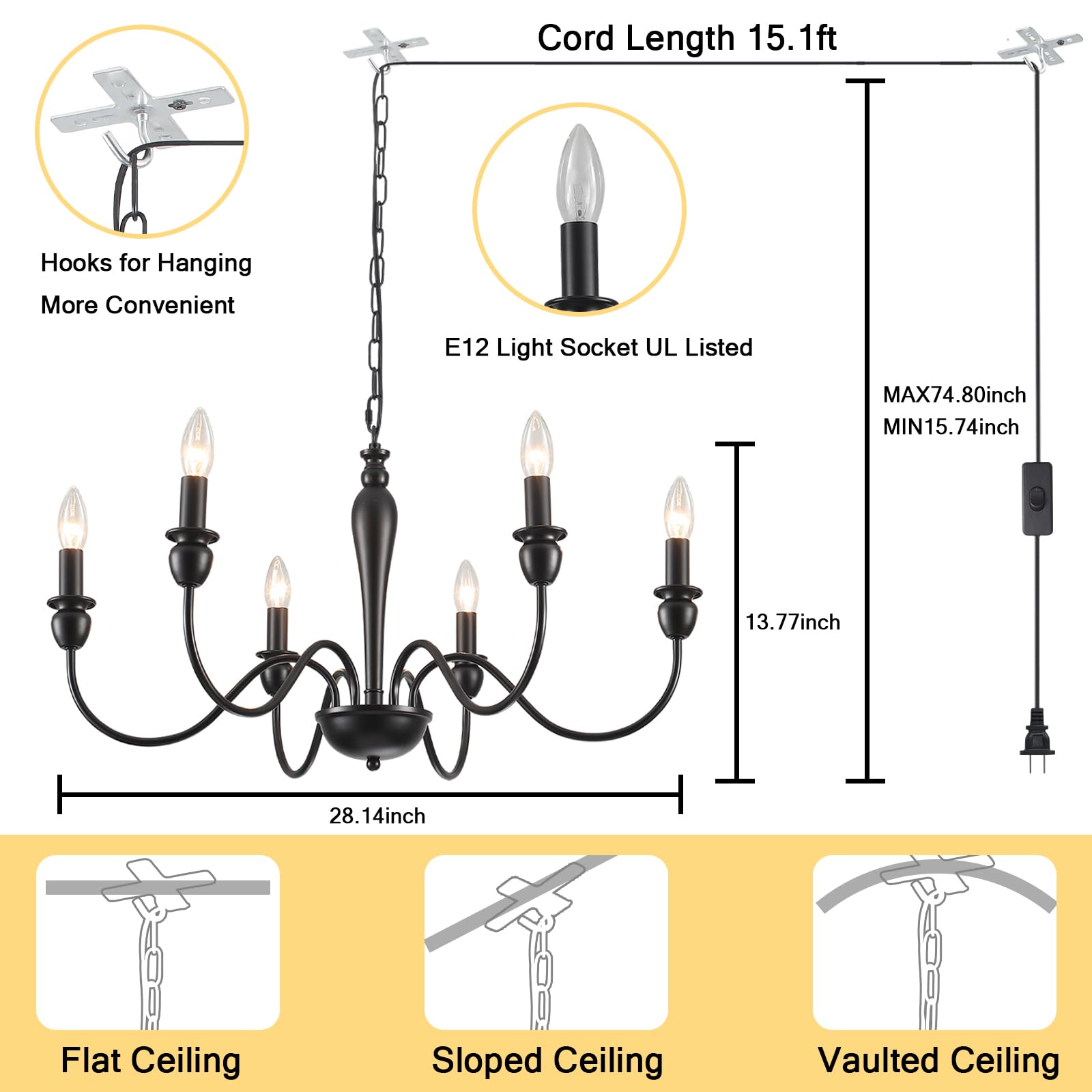 LXWNYY Plug in Chandelier with Long Cord 15.1ft, 6 Lights Farmhouse Light Fixtures Hanging Lights with Plug in Cord, Black Plug in Candle Chandier for Living Dining Room Bedroom Kitchen