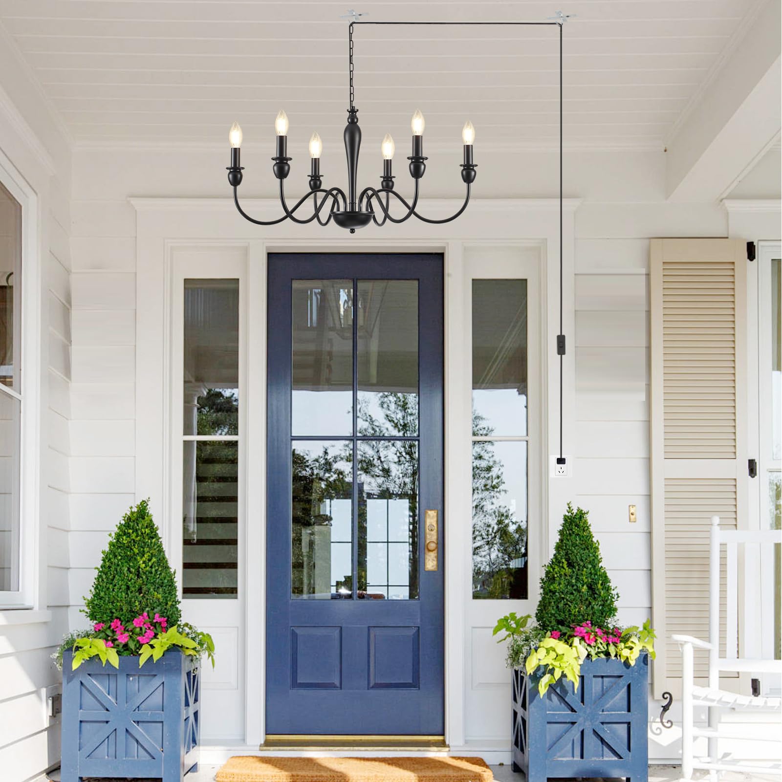 - 【Premium Quality plug-in chandelier】Plug in hanging light Crafted from premium iron metal with black lacquer finish, this plug in light fixture exudes a sleek, modern farmhouse aesthetic. The robust construction ensures unparalleled durability, making it a perfect centerpiece for any space, including dining areas, outdoor chandelier for porch, hanging lamps for living room plug in,and bedrooms. Ideal for commercial spaces such as cafes and restaurants as well.