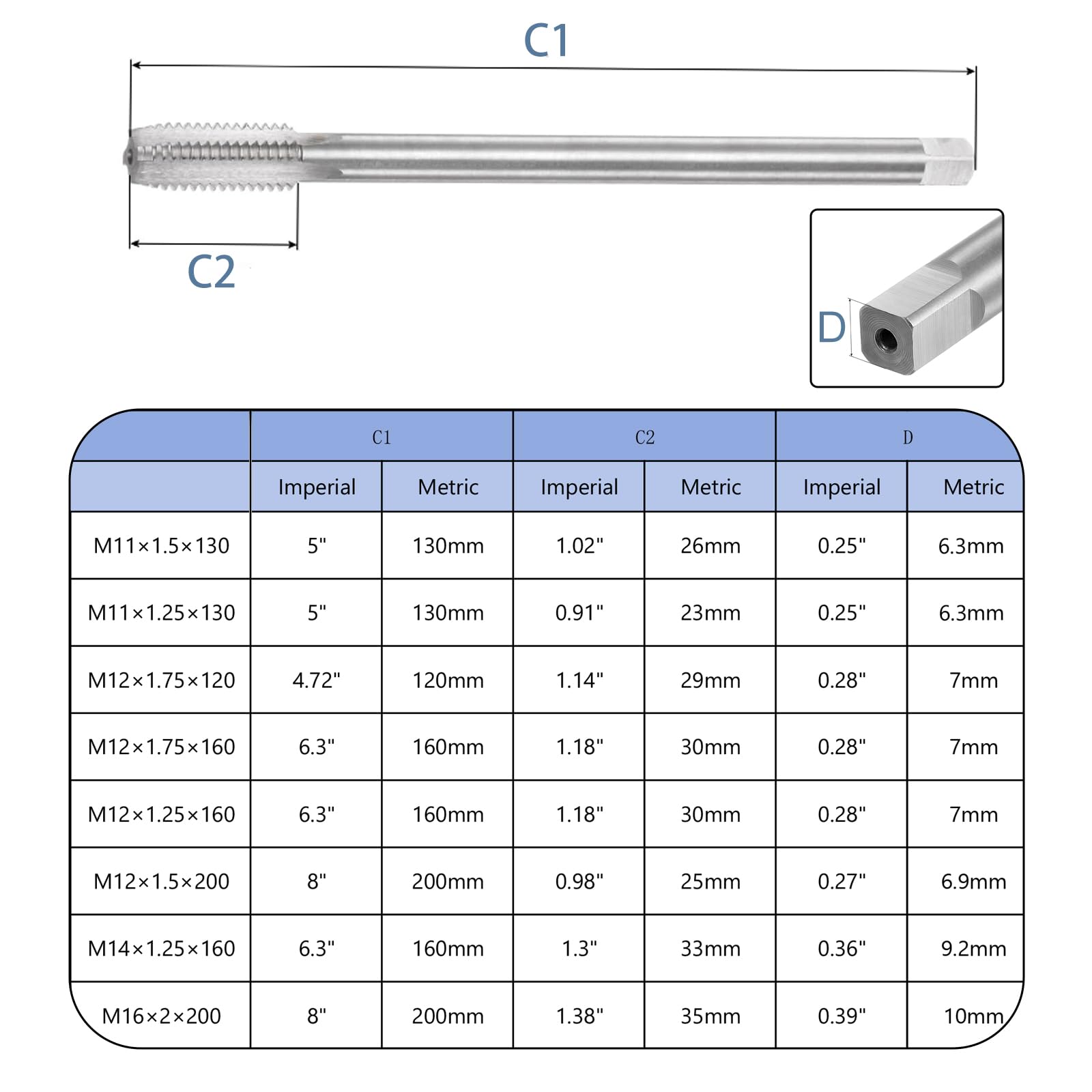 - Metric Thread Tap-Thread size: M14 x 1.25 (right hand); accuracy: H2; total length: 160mm / 6.3" (extra long); square shank width: 9.2mm / 0.36"; thread length: 33mm / 1.3"; number of chip flutes: 4 flutes