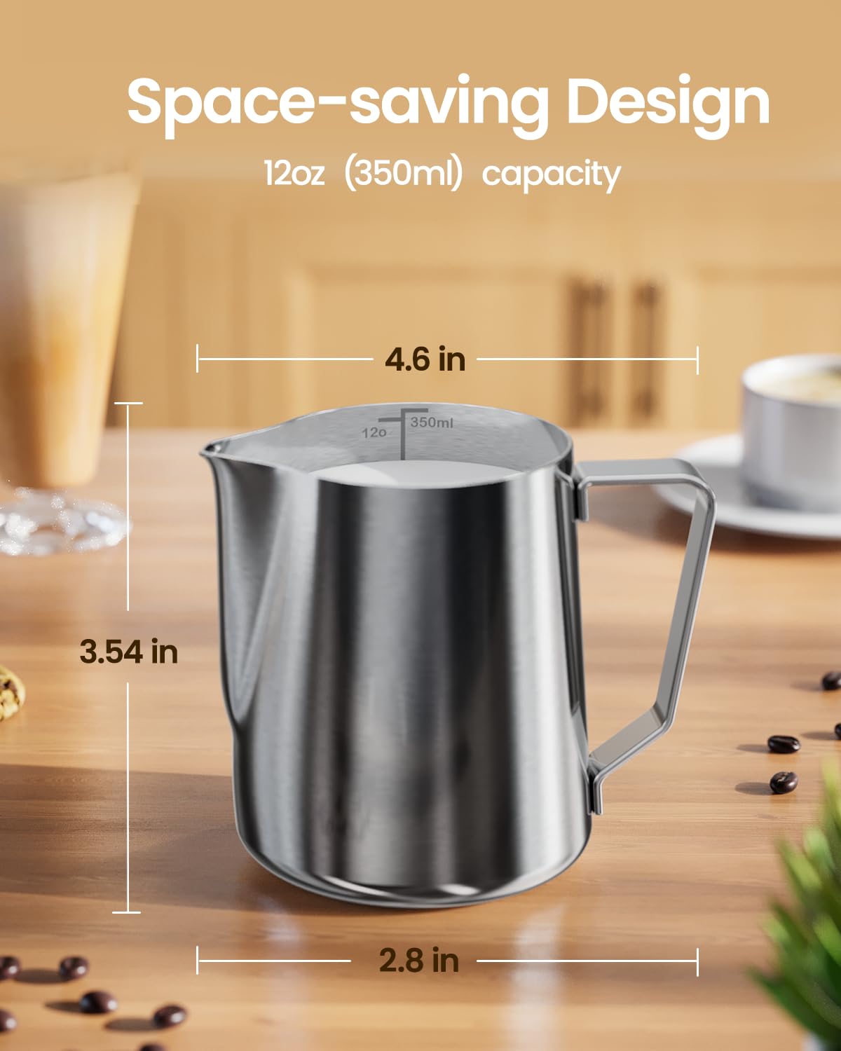 - Clear Measurement Scale: Setting our milk pitcher apart from others, it boasts clear internal measurement lines for accurate portion control of milk or cream per cup of coffee. Additionally, it can be used to measure various liquids such as milk, cream, water, juices, batter mixes, and smoothies.