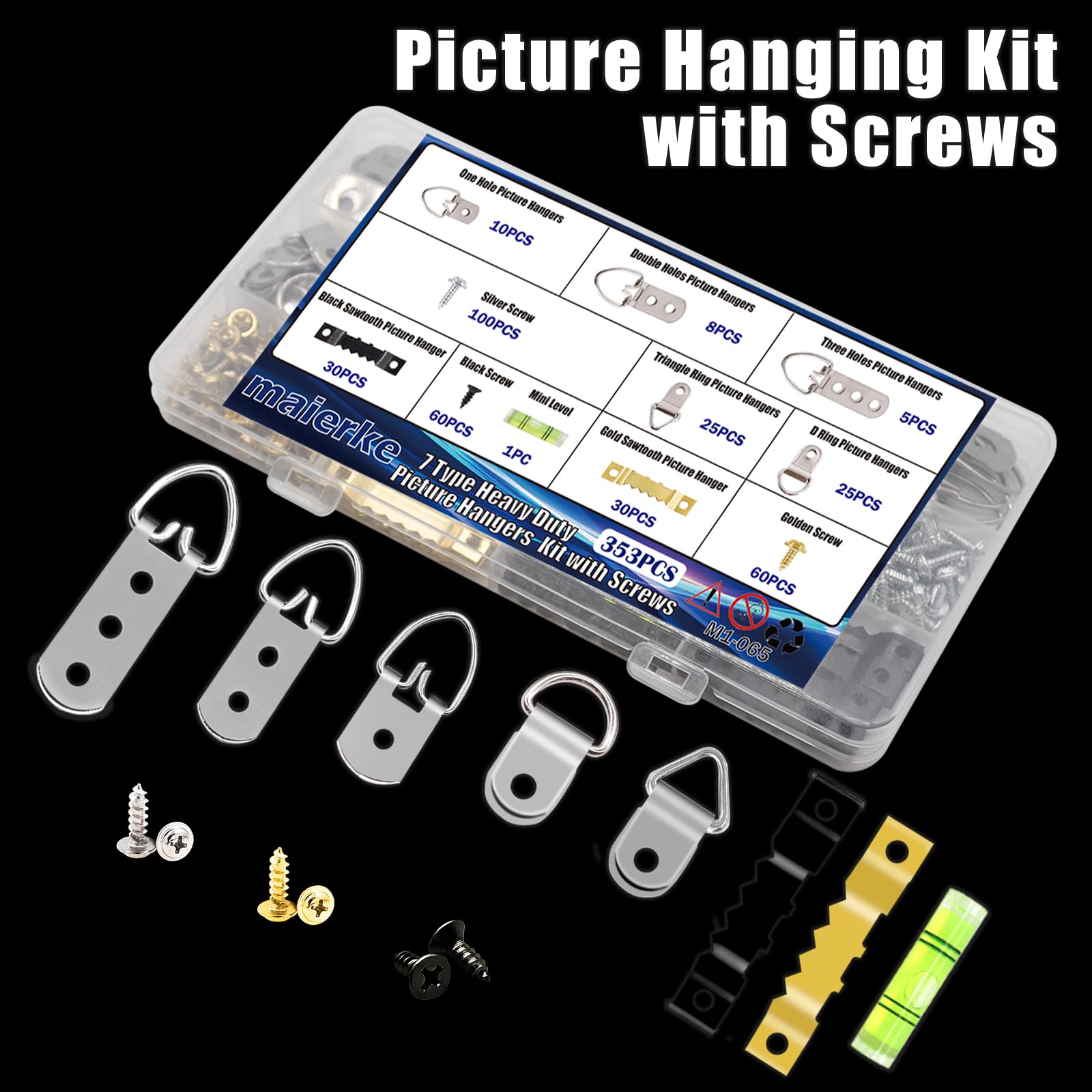- Packaging Includes: maierke picture frame hook box contains 7 types, totaling 353PCS, including: 30pcs black saw-tooth, 30pcs gold saw-tooth, 25pcs d-ring, 25pcs triangle ring, 10pcs one hole d ring, 8PCS Double holes D Ring,5PCS Three Holes Picture Hangers,60PCS Black Screw, 60PCS Gold Screw, 100PCS Silver Screw