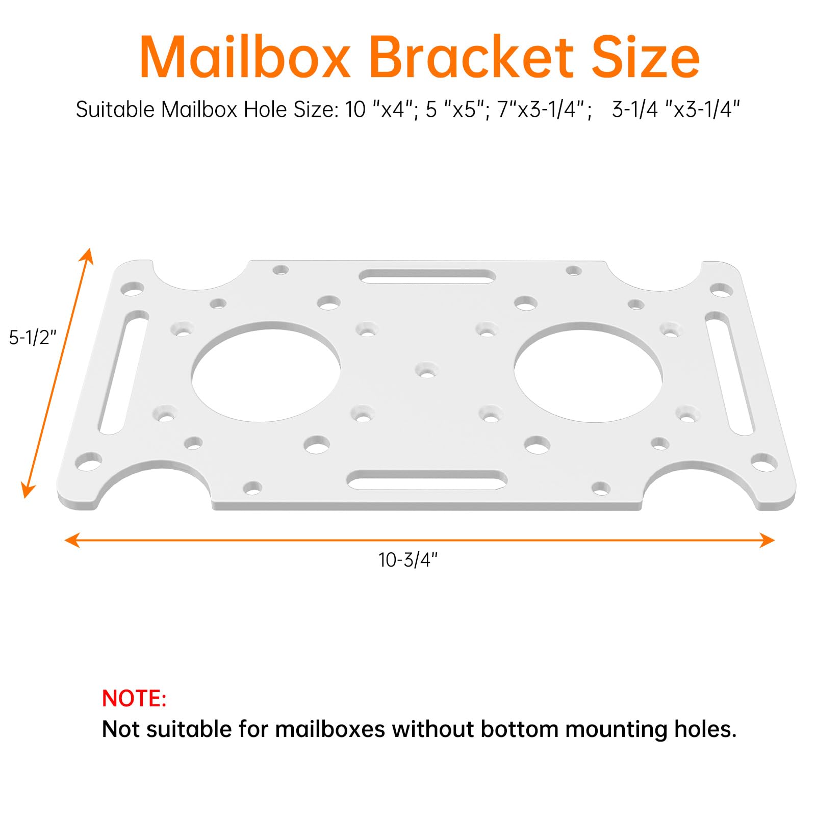 - Mailbox Bracket Easy Installation: With its straightforward design, this bracket allows for hassle-free installation and setup.Suitable Mailbox Hole Size: 10"x4"; 5"x5"; 7"x3-1/4”; 3-1/4"x3-1/4" ,Mounting hardware included