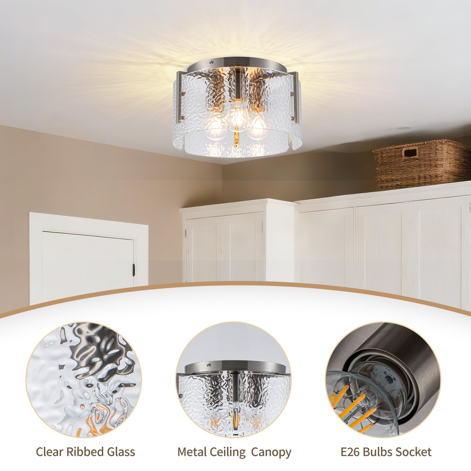 - Sturdy & Stylish Design: This 3-Light nickel flush mount ceiling light features a durable metal frame and clear ribbed glass shade. It resists rust, dust, and corrosion, diffusing light evenly to prevent glare and enhance room aesthetics. Perfect for modern or farmhouse decor.