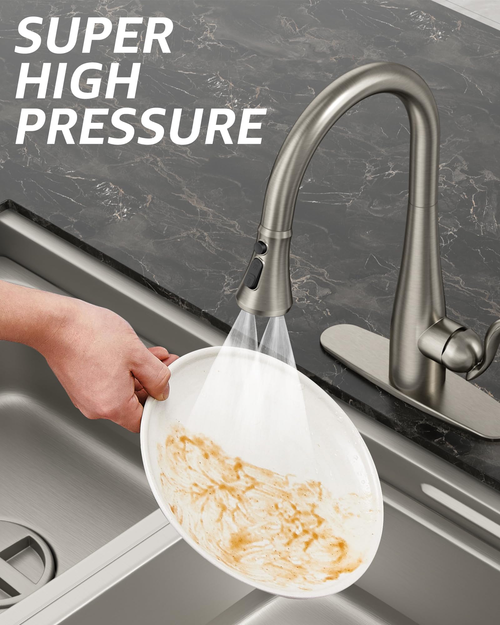 - 【Switching Between 3 modes】 MBILLION High Pressure Pull Down Kitchen Faucet Head Brushed Nickel has 3 modes: stream, spray,blade spray modes; The blade spray mode has very strong power to easily flush food residue.