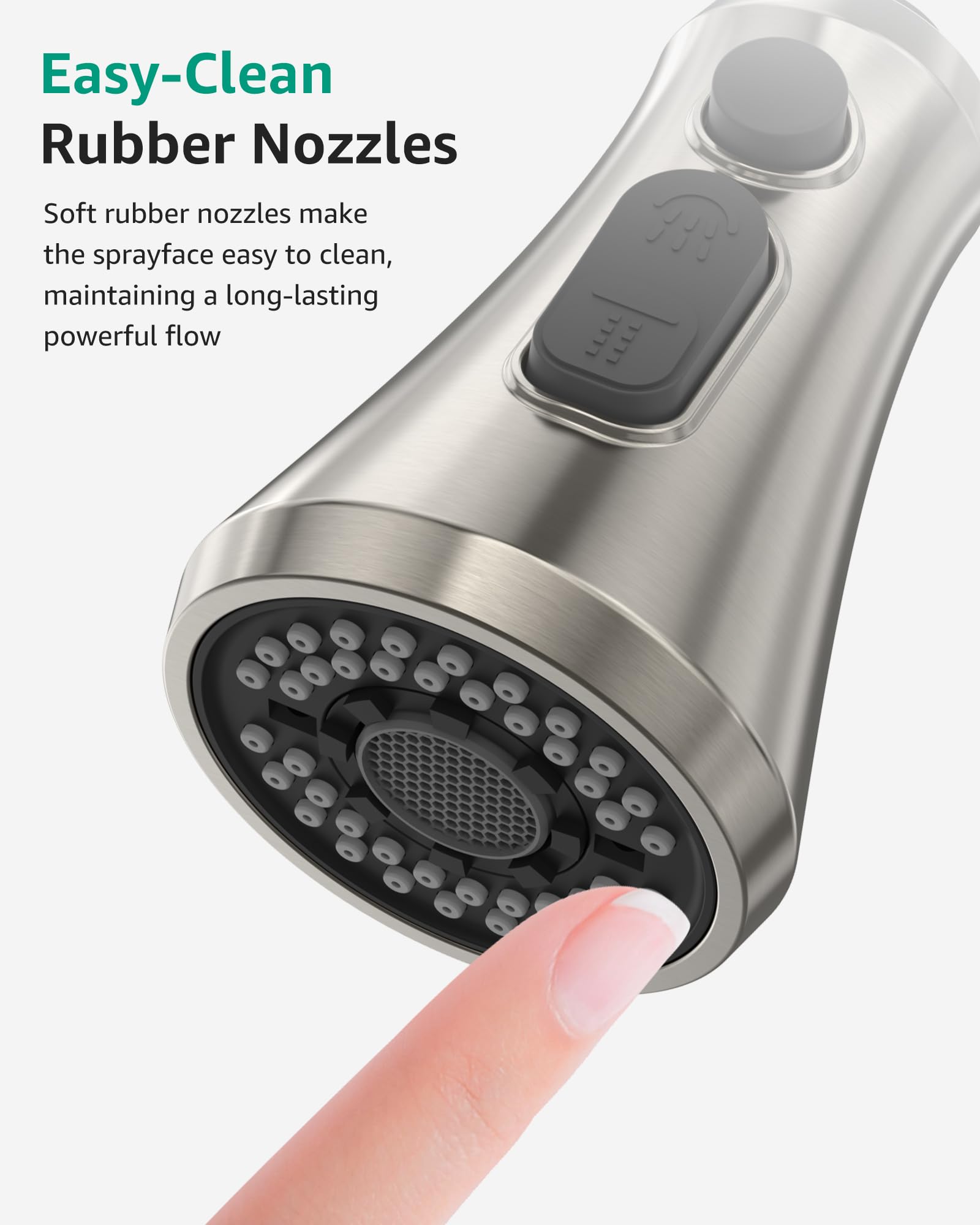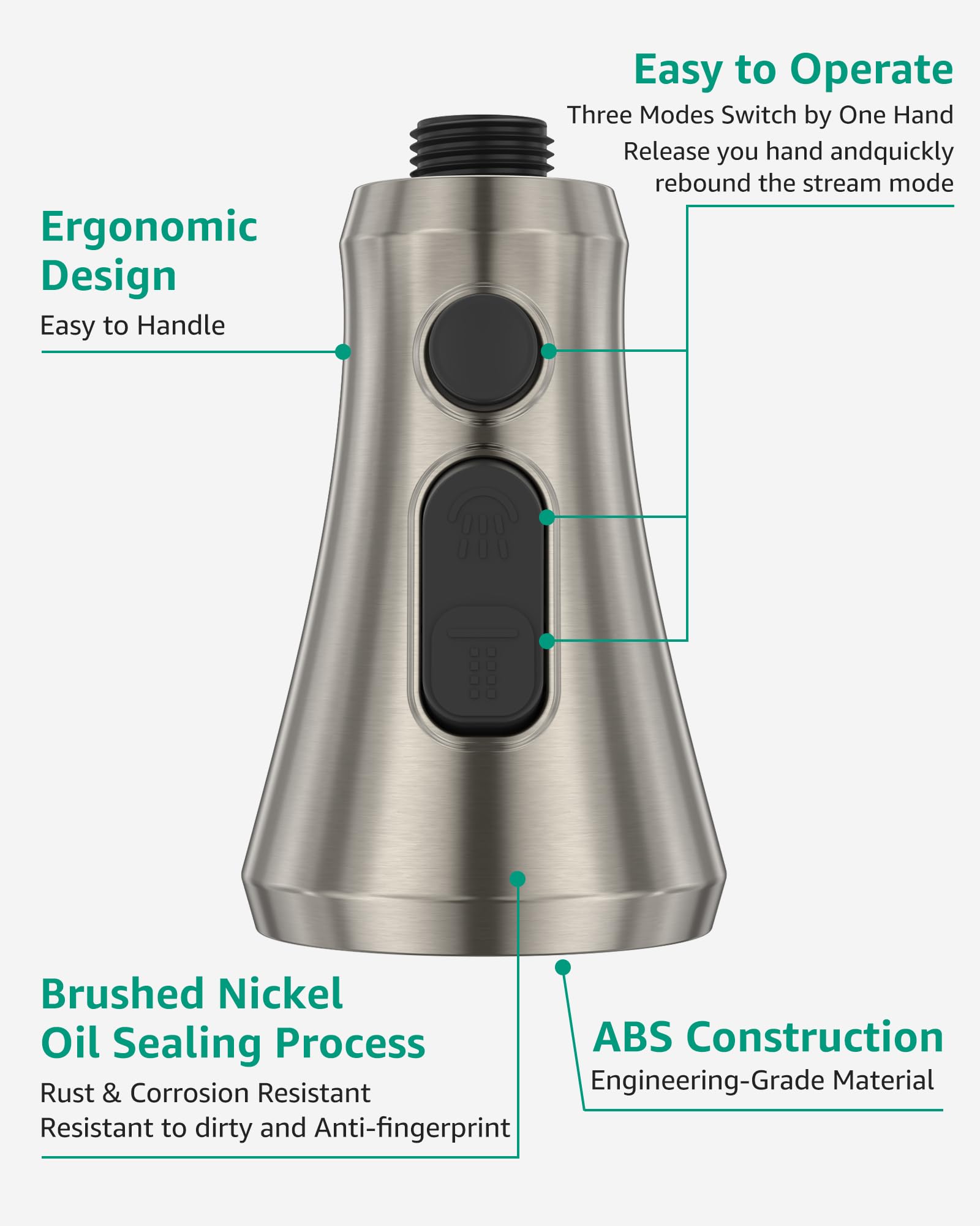 - 【Premium Quality & No Dripping】 MBILLION Brushed Nickel Kitchen Faucet Sprayer Head Replacement,designed for pull-down faucets, is crafted from high-grade engineering ABS plastic with an ergonomic design and a scratch-resistant finish that ensures durability and rust resistance. The Kitchen Faucet Spray Head features silicone nozzles for easy cleaning.