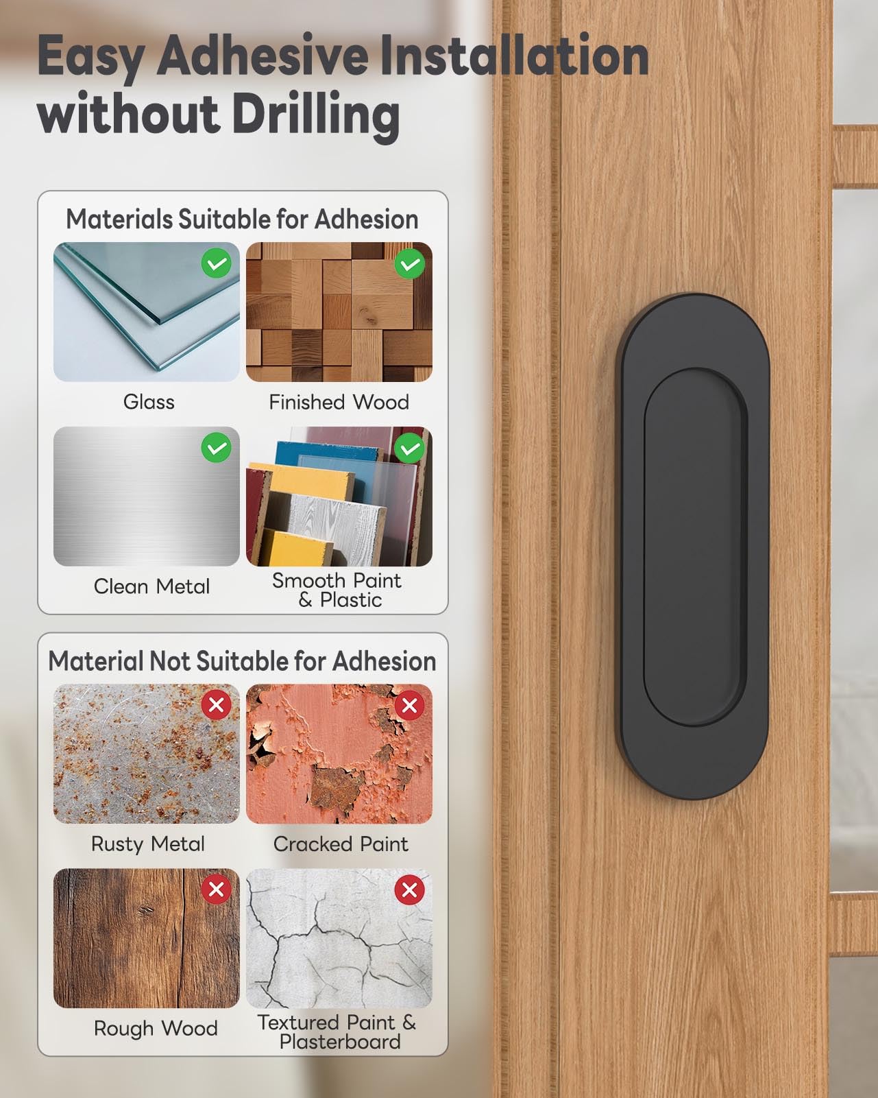 - No Drilling Needed: Unlike traditional recessed handles, MeBanToo oval self-stick cabinet handles require no cutting/grooving. Simply peel the protective film and press adhesive handle firmly on the door surfaces, the installation is completed in seconds