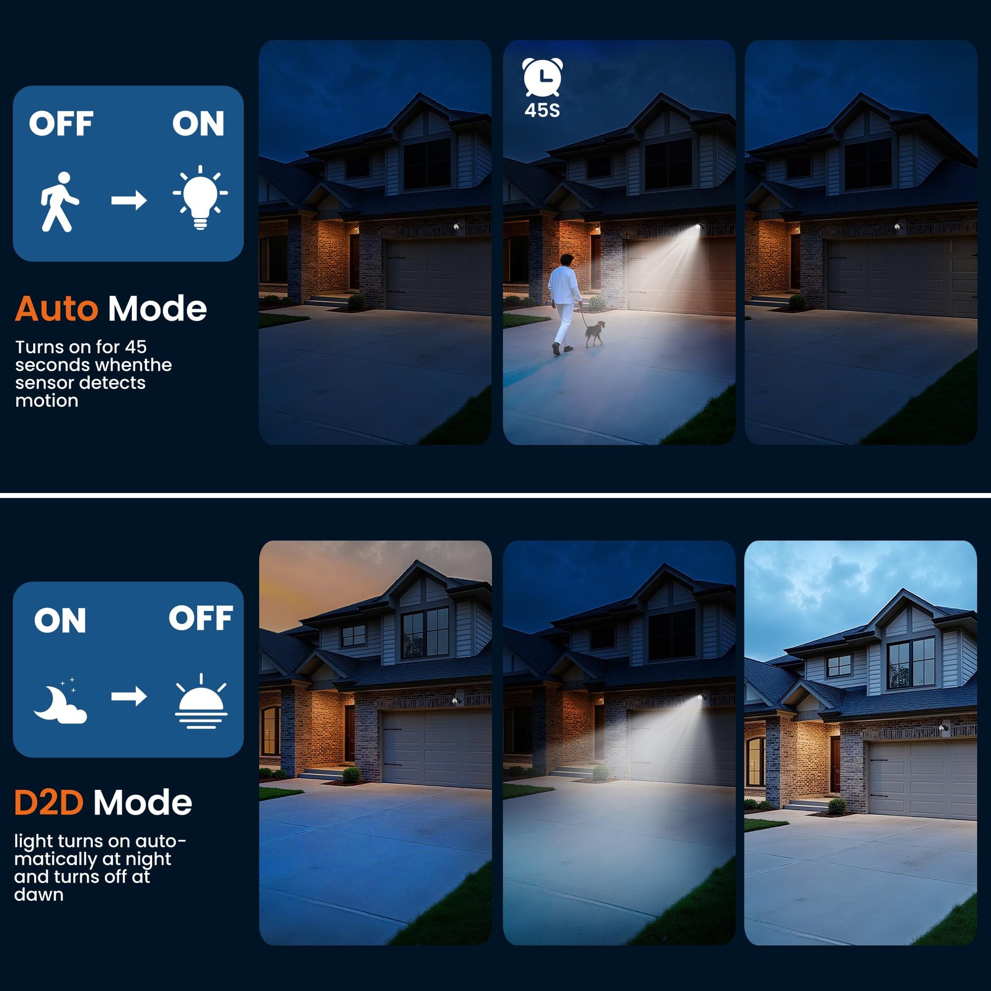 - 【2 Modes Spot Lights Outdoor】①Dusk to Dawn Mode(activates automatically): Automatically turns on at sunset/off at sunrise (Security LED lights dusk to dawn). ②Auto Mode: Activates at 30ft detection range, perfectly suit your outdoor security light requirements