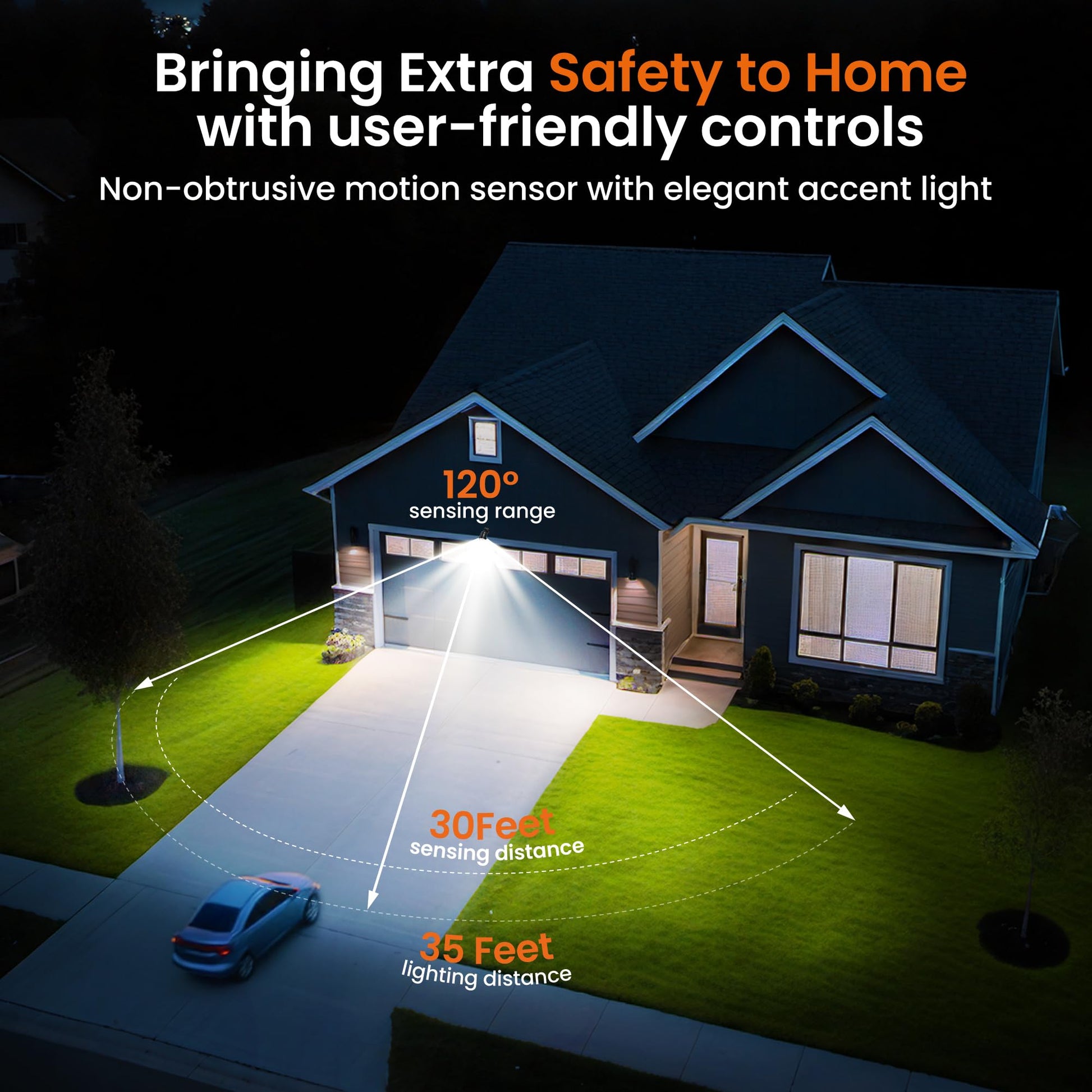 - 【Bright 600 Lumen Motion Light】 provides stable light output to illuminate your outdoor space. 120° wide-angle motion detection and 30-foot sensing distance make it ideal for driveways, garages, and porches