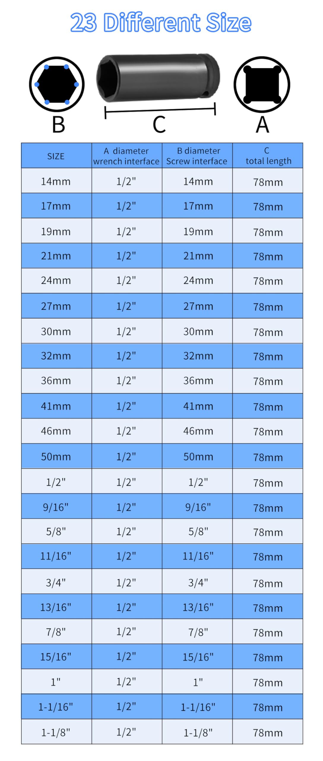 - Versatility - Adapted for impact wrenches with a 1/2 inch drive, used for automobile maintenance, electromechanical maintenance, household maintenance and other scenarios