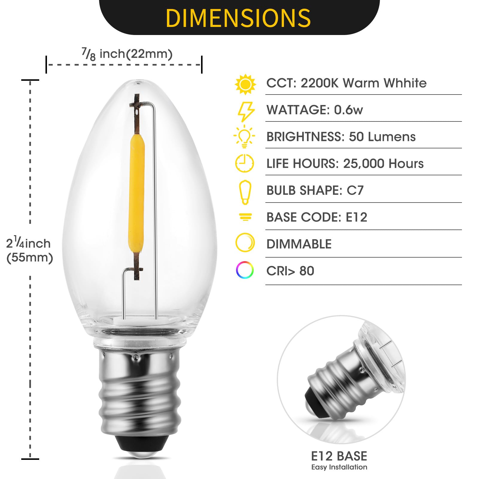 - Quality-assured Materials for Long-Lasting Lifespan: Crafted with a high-quality strong tangle-free cord and energy-efficient C7 LED bulb lasting up to 25,000 hours, the extension cord with bulbs is easy to use and safe to touch due to the low voltage.