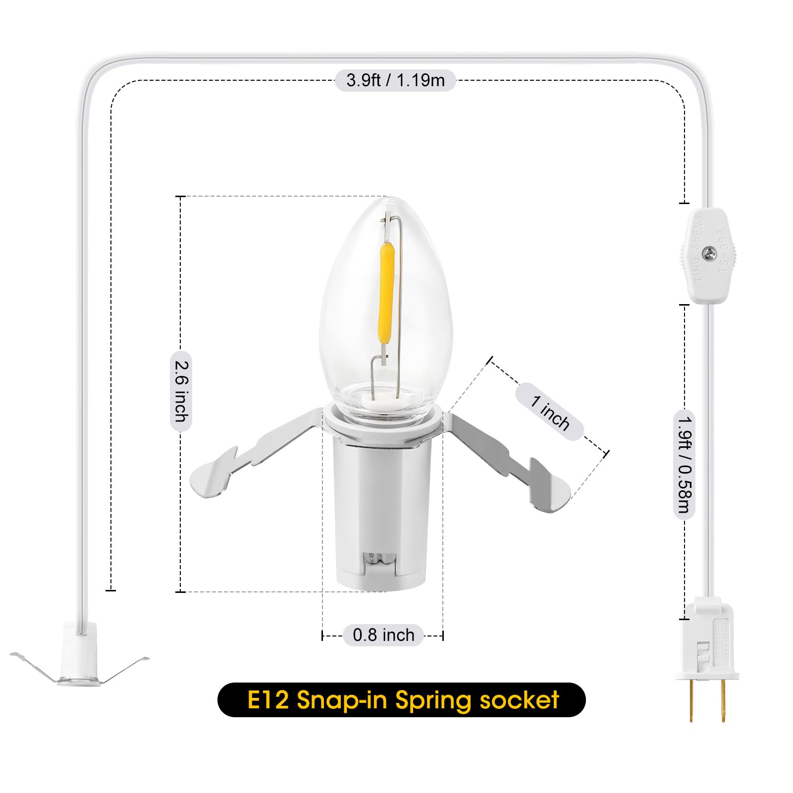 - Accessory Cord with C7 LED Bulbs and On/Off Switch: The accessory cord is 6ft long for easy connection to a wall outlet. UL-certified plug for safe use. features a 360°on/off rotary switch that quickly turns the light on and off with a simple push of a button for easy light control.