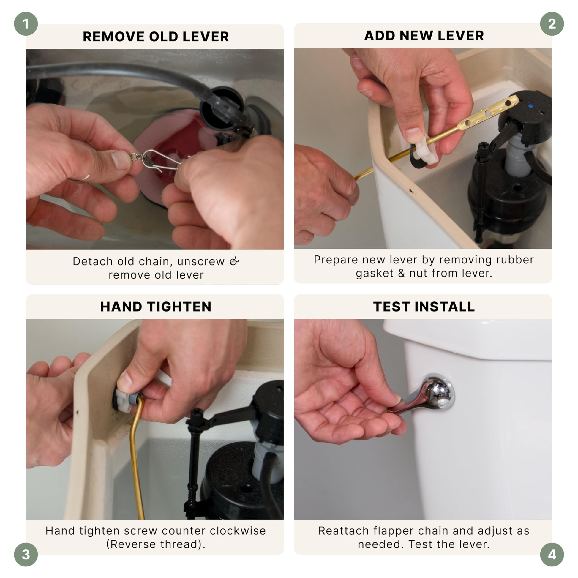 - Complete replacement kit - This product includes: Toilet handle and brass lever, stainless steel flapper toilet chain with clips, a reverse thread lock nut, rubber gasket, and a detailed instruction card provides step-by-step directions, ensuring you have everything needed for a complete upgrade. Step-by-step instructions guide you through the installation process. Every handle includes a stainless steel flapper chain for a complete replacement.