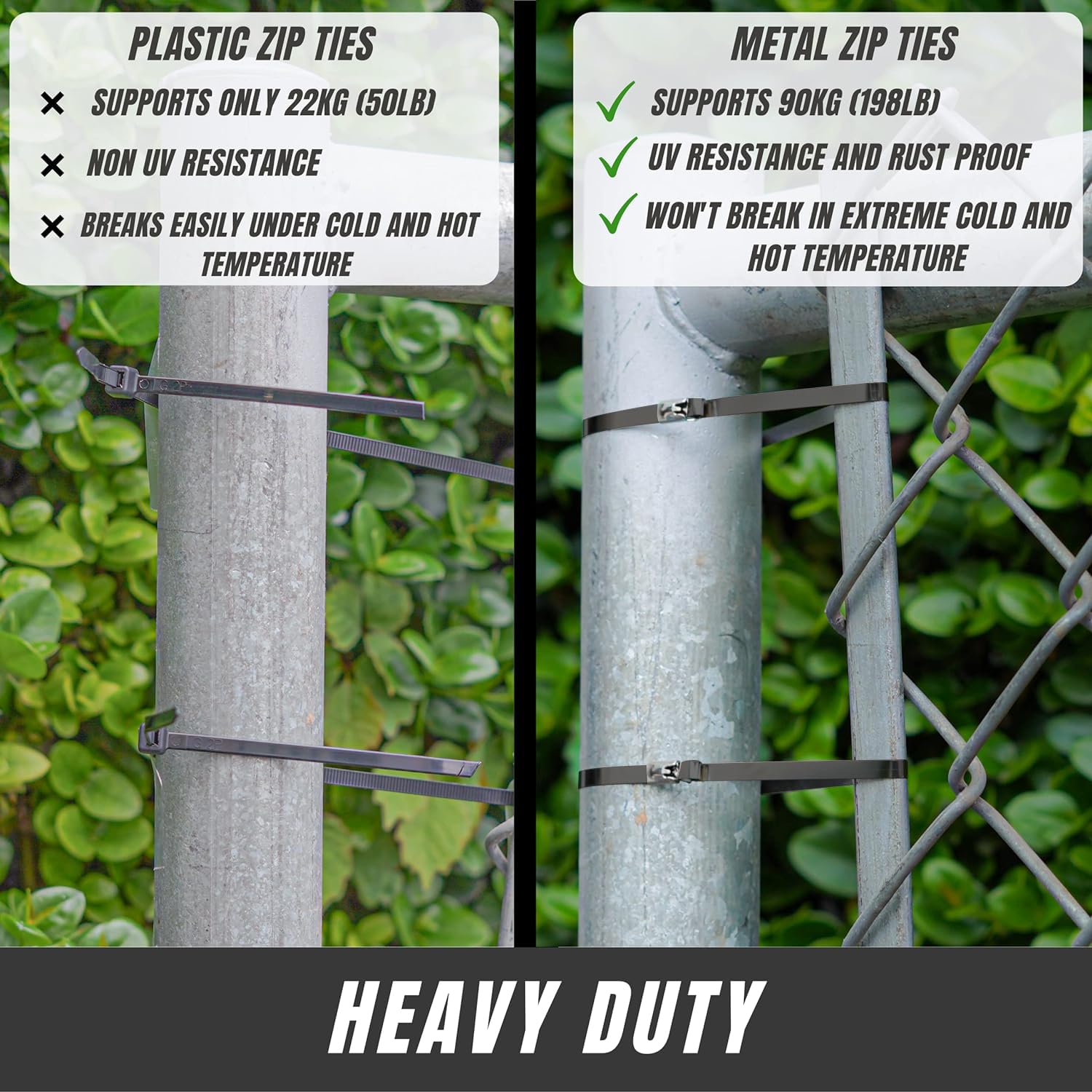 - FEATURES - Metal zip ties made of stainless steel. These heavy duty zip ties are 4x stronger than regular plastic zip ties. These stainless steel zip ties mean they are High temperature resistant, Cold resistant, Rust and Corrosion resistant. Unlike traditional plastic zip ties, these heavy duty metal ties won't break down by uv light in the sun like normal plastic zip ties.