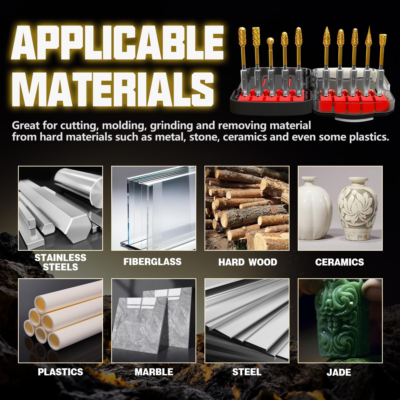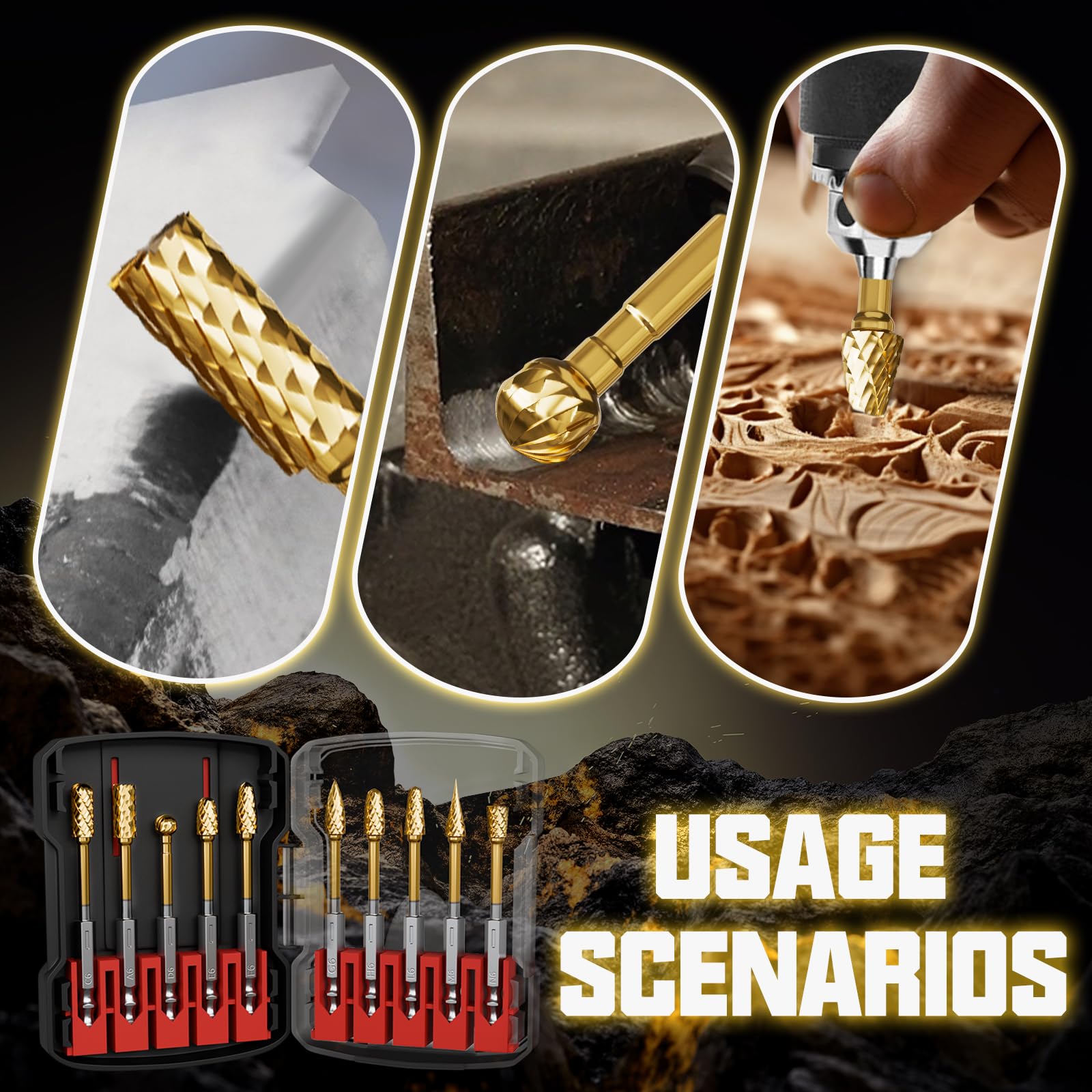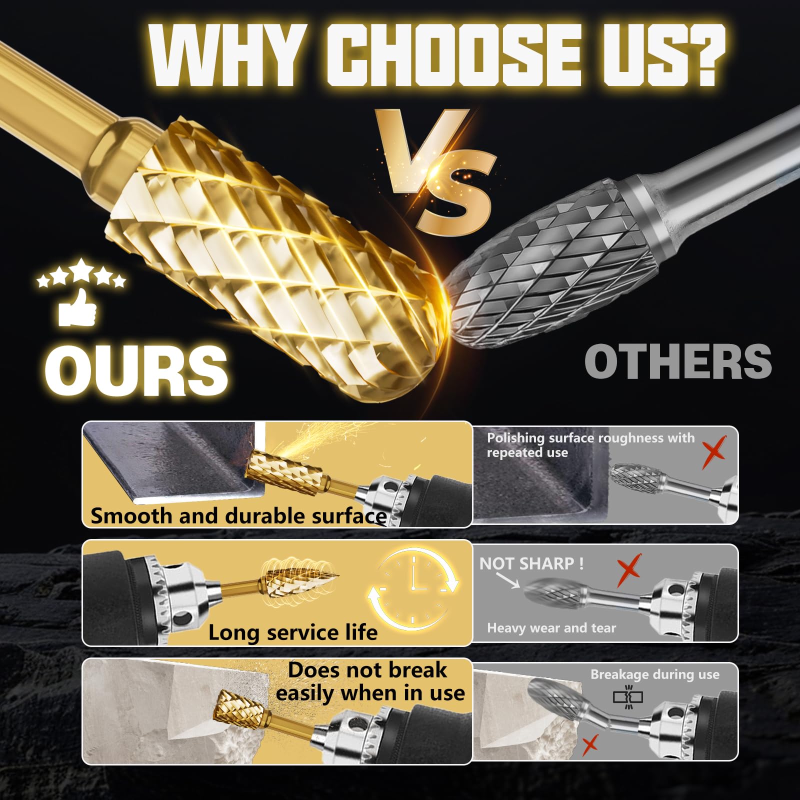 - 【Long-Lasting Carbide Burrs】 – Tungsten carbide construction with gold titanium coating resists wear, rust, and heat, doubling lifespan compared to standard steel bits.