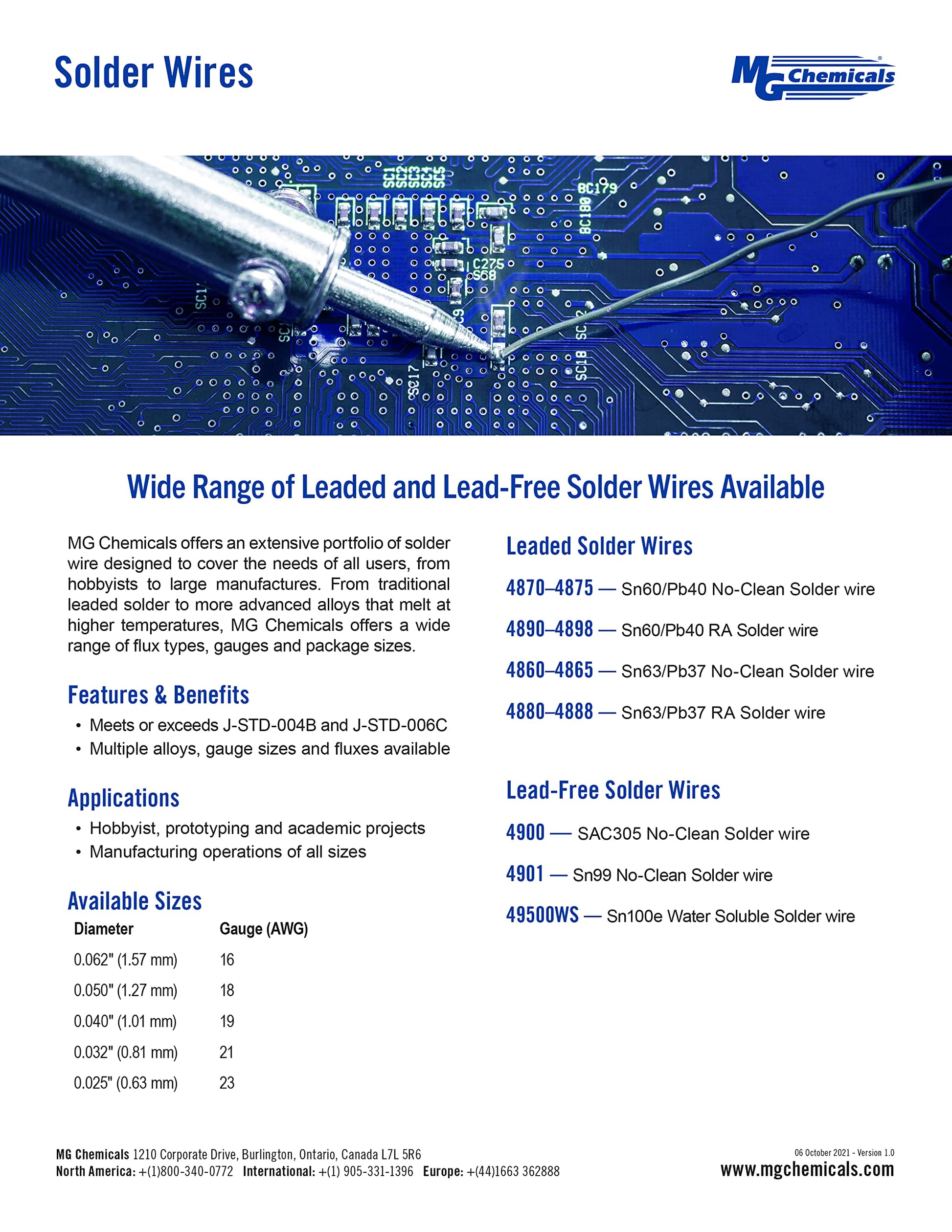 Details: M.G. Chemicals no clean Lead-Free Solder was designed with 96.3 percent tin, 0.7 percent copper and 3 percent silver alloys as a lead-free alternative for the standard Tin and Lead solder. These alloys conform to the impurity requirements of J-Std-006 and RoHS. Use this solder anywhere you would use normal solder. M.G. Chemicals Unleaded Solder utilizes a state-of-the-art automatic wire extrusion and wire drawing machines to manufacture consistent solder. The introduction of flux core in the wire extrusion process involves constant monitoring of flux percentage to ensure minimal flux voids and irregular wire. Typical flux percentage for our Unleaded Solder is 2.0-4.0 percent. A unique flux system was specifically used for high temperature Unleaded alloys. It provides the fluxing activity levels that promote fast wetting action and maximum wetting spread. Utilizing synthetically refined resin and very effective activator that wets and spreads like an RA type. This special activator exhibits virtually no spattering. Activator conforms to J-STD-004, REL0. Cleaning Flux core is a no clean formulation therefore the residues do not need to be removed for typical applications. Ag content: 2.8-3.2 percent . Cu content: 0.3-0.7 percent . Sn content: Balance. Flux classification: ORL0. Copper mirror: no removal of copper film. Silver chromate: pass. Corrosion: pass. SIR JSTD-004,Pattern down: 2.33 x 10 11 ohms. SIR Bellcore (Telecordia): 6.12 x 10 11 ohms. Electromigration: pass. Post reflow flux residue: 55 percent . Acid value: 190-210. Flux residue dryness: pass. Spitting of flux-cored solder: 0.30 percent . Solder spread : 130 mm2. Melting point: 217-221 degree C (422.6 - 429.8 degree F). Upper temperature limit: do not to exceed 350 degree C (tip temperature). Wire diameter: 0.032" (0.81 mm). Standard wire gauge: 21. Tolerance: +/- 0.002". Hardness, brinell: 15HB. Coefficient of thermal expansion: pure Sn=23.5. Tensile strength: 4312 psi. Density: 7.39 g/cc.
