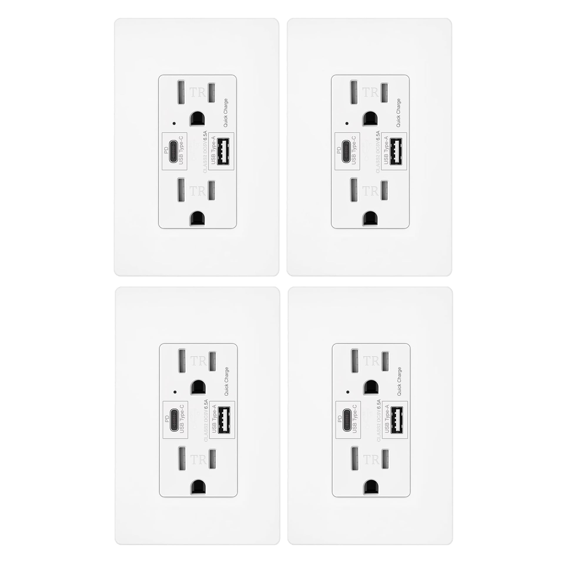 Micmi USB C Pd 65w Outlet Wall Dual High Speed Receptacle Smart Fast Charging Capability, Tamper Resistant Wall Plate Included UL Listed (4Pack, White, 65W USB c PD Outlet)