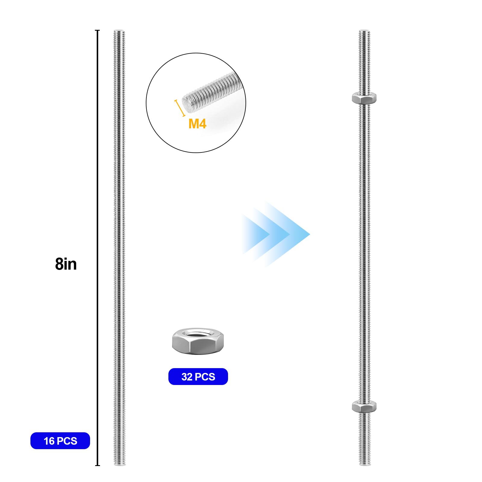 Details: You will get 16 pieces of 304 Stainless Steel 8/32 inch M4 8 inch threaded rods and 32 pieces of Stainless Steel M4 hex nuts, 48 pieces in total. perfect garden stakes for decorative beaded garden stakes and other outdoor decorations.