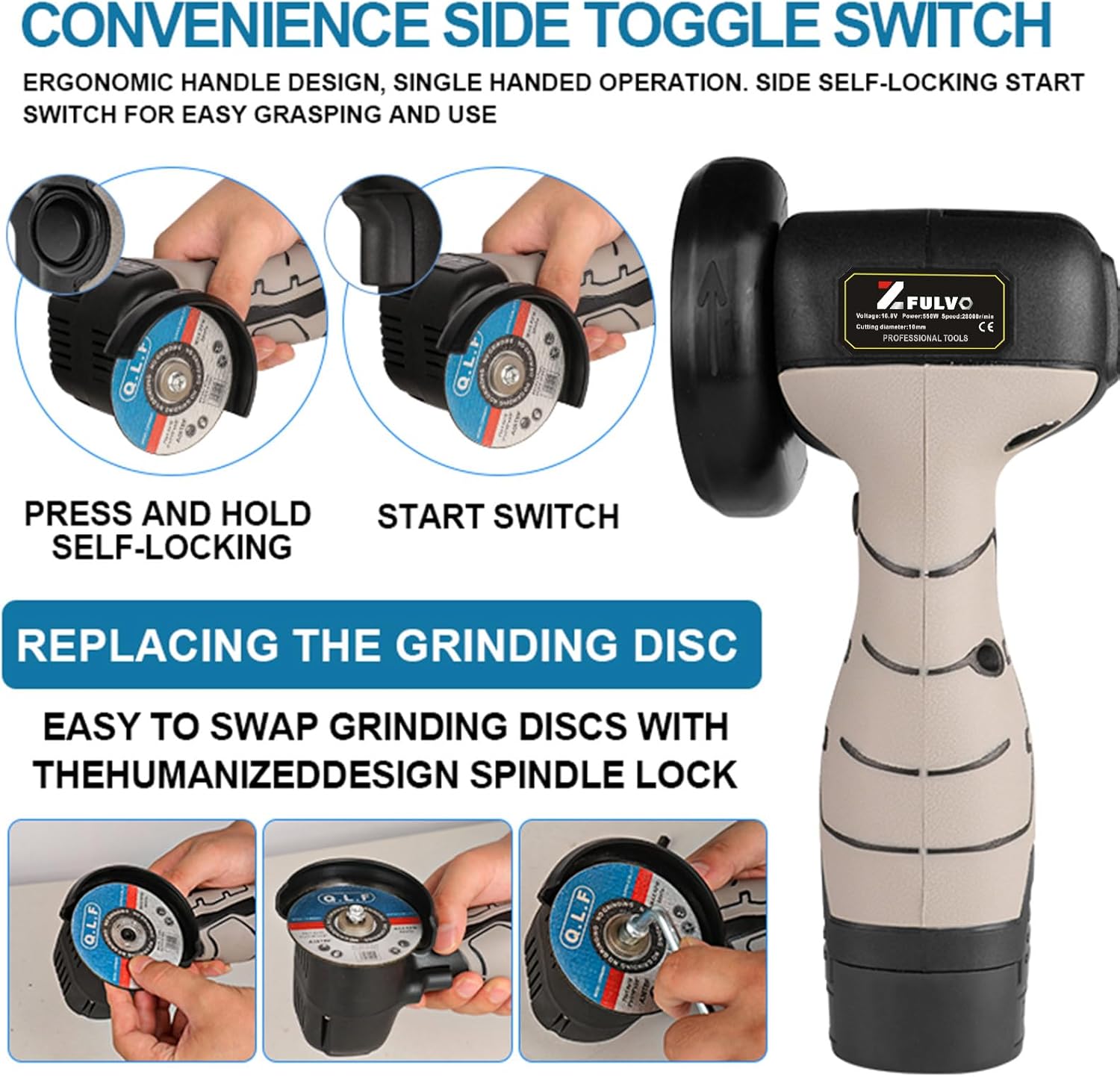 - 【Comfortable Handholding / Reasonable Design】The angle battery grinder comes with a handheld rubberized handle and non-slip texture, mini angle grinder bringing you a better using experience. Humanized design spindle lock is easy to change the grinding disk. Side toggle switch design, side automatic locking start switch, small angle grinder ergonomic handle design, easy to grip and use, one hand operation