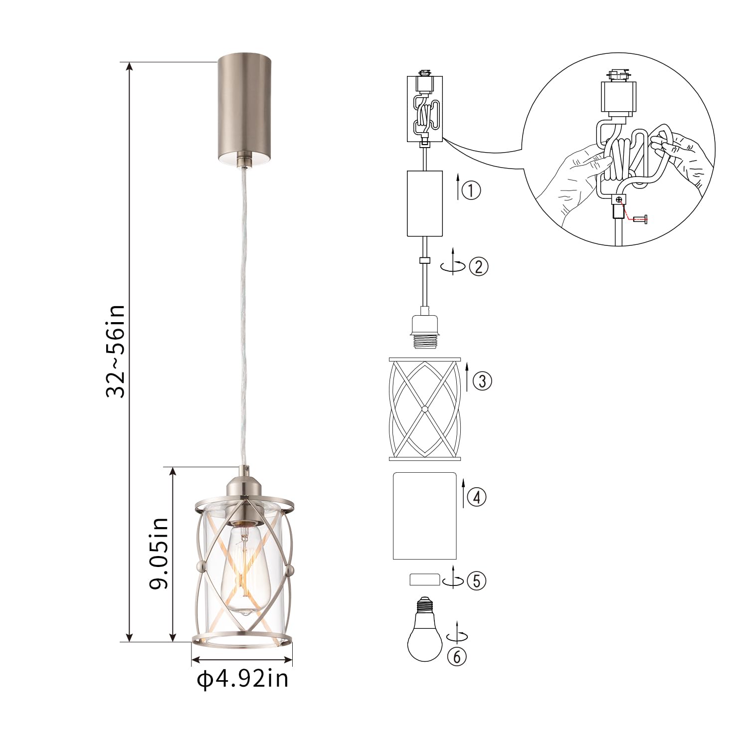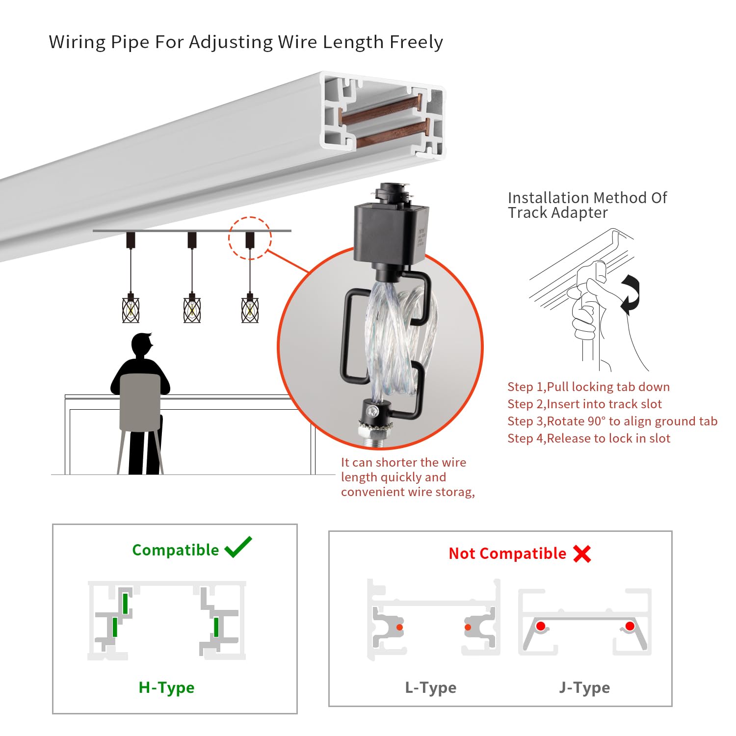 - Hanging length adjustable, 22.95~46.95 inches, easy to install, fit in H style 3-wire single circuit track system.