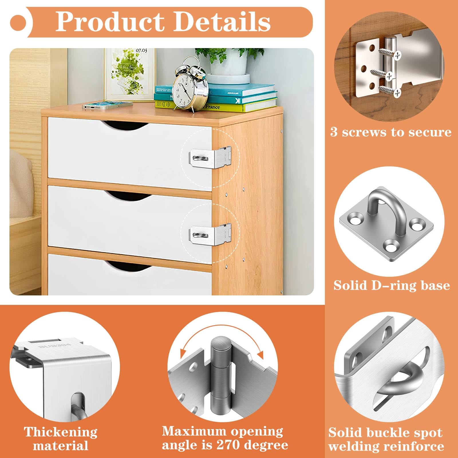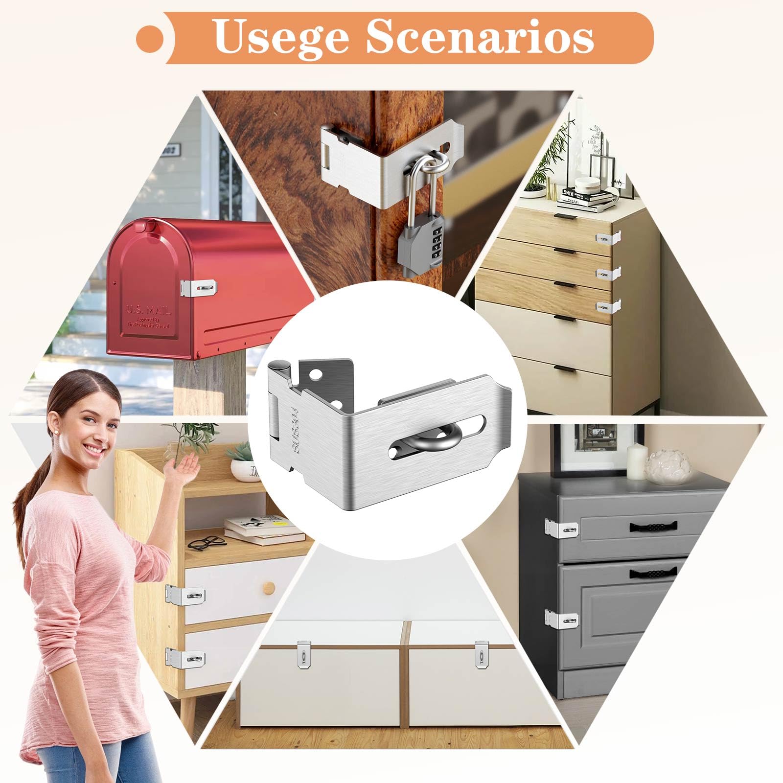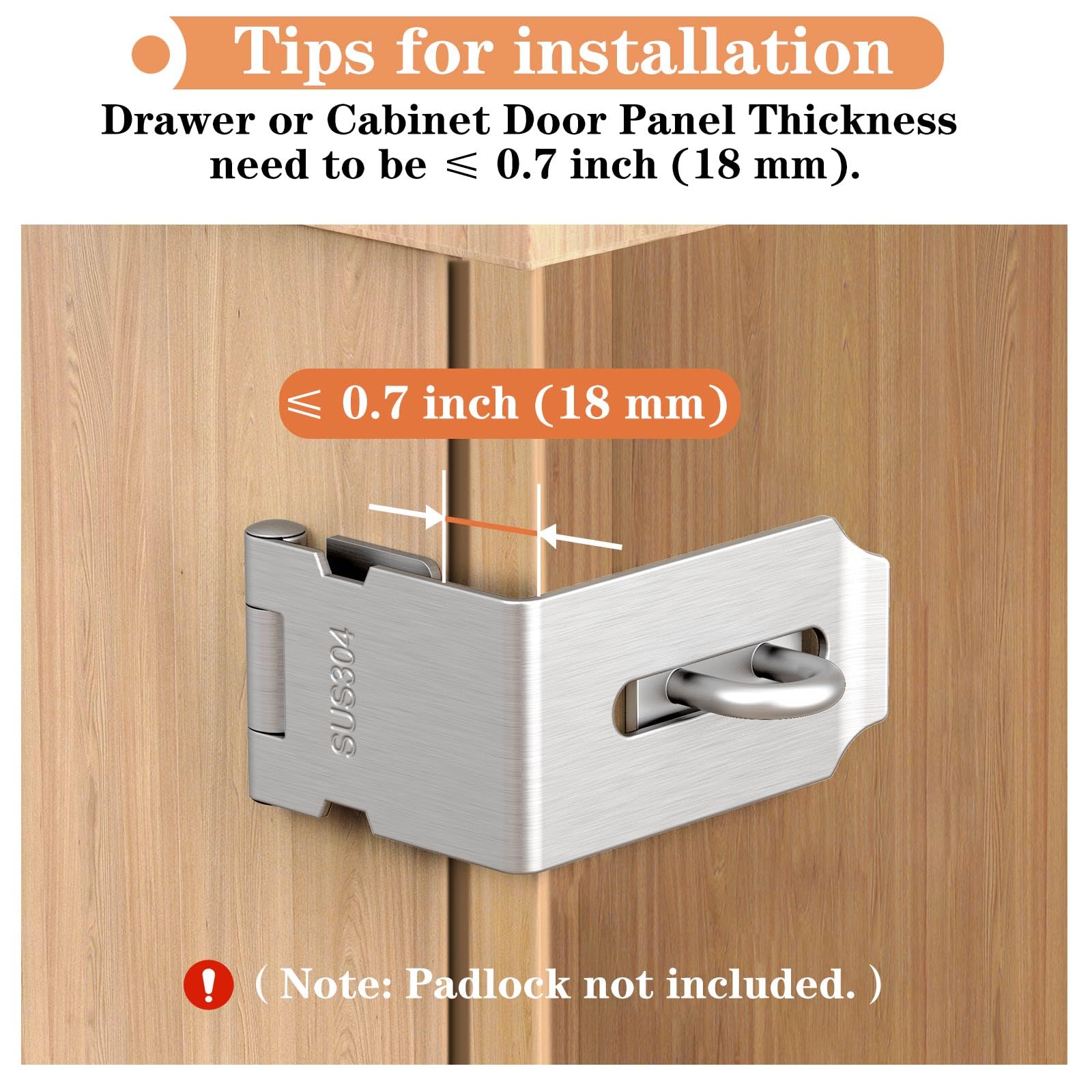 - Multi-angle Use: The 90 degree right angle clasp hasp lock has flexible mounting direction, suitable for all kinds of cabinets, drawers, toolboxes, wooden boxes, cupboards. Note: Drawer or cabinet door thickness must be ≤ 0.7 inches (18 mm)