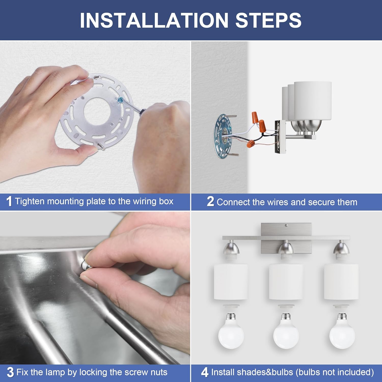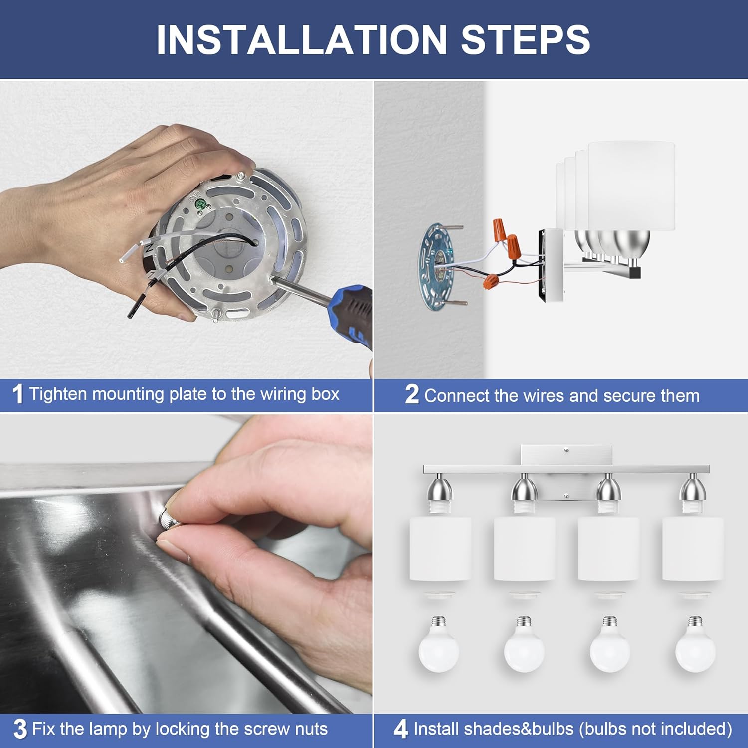 - Easy Installation Bathroom Light Fixtures: Installing the 4-light vanity lights for bathroom is quick and easy. The package includes all necessary mounting hardware, and the lights can be installed in an upwards or downwards position according to your preference. The open bottom design also makes it effortless to change bulbs when needed. We suggest you to wear gloves to avoid scratches when installing the wall lights. Please consult a qualified electrician if you’re not sure how to install it.